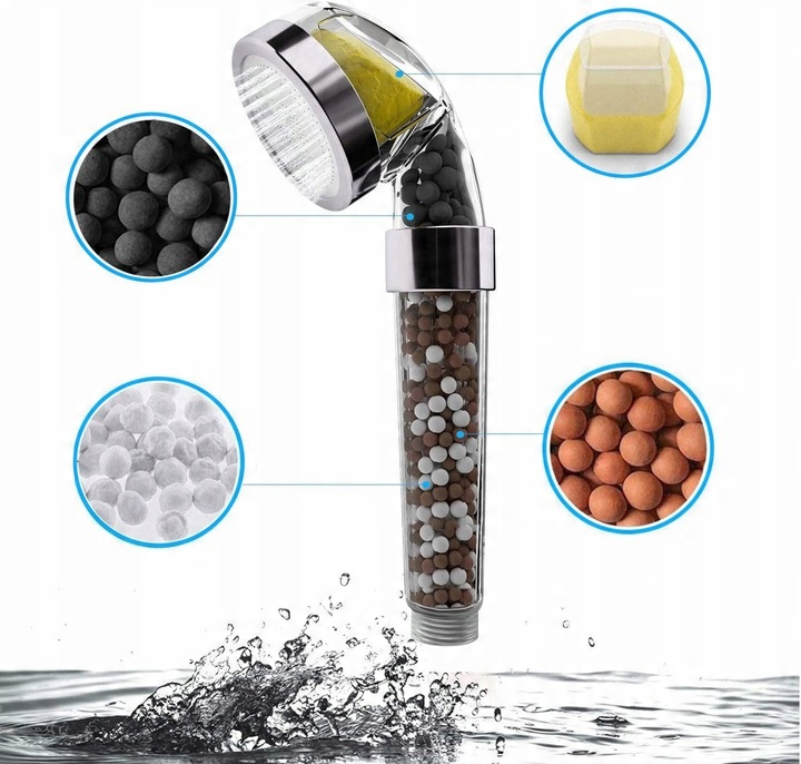 - 4 типа ФИЛЬТРУЮЩИХ ШАРИКОВ + Научная пропорция картриджа с витамином С находится в насадке душа, смягчает жесткую воду. Поддерживает баланс pH воды. .