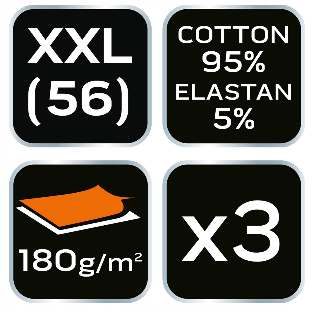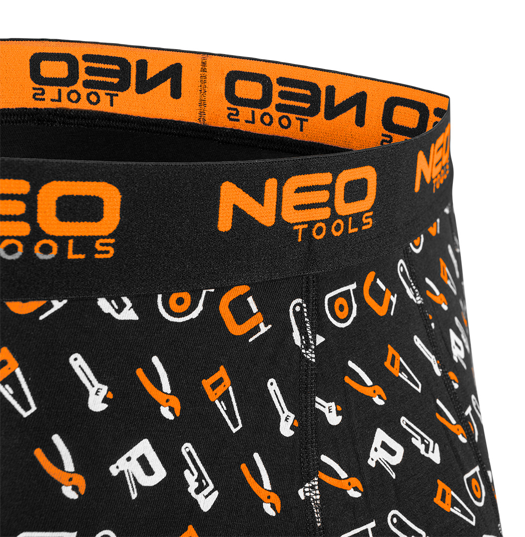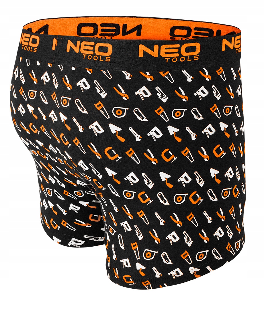 Базовые боксеры, 3 пары, размер XXL 81-679-XXL от NEO Tools — комплект из трех мужских боксеров в трех цветах (гладкий черный, черный с точечным принтом на штанине и черный с узором «инструмент»). в белом и оранжевом цветах). Изготовлен из цельного трикотажа, состоящего из 95% хлопка и 5% эластана. Их плотность составляет 180 г/м². Оснащен мягкой жаккардовой резиной с оранжевым логотипом. Имеют плоские швы на передней панели, дополнительную панель в области промежности и отсутствие боковых швов. Гладкие ножки также делают их удобными в ношении. На внутренней стороне белья напечатана размерная этикетка с составом и инструкциями по уходу. Боксеры были упакованы в картонную коробку с окошком. Одежда принадлежит собственному дизайну бренда NEO Tools. Рекомендуется в качестве оригинального подарка на Мужской день, День святого Валентина или любой другой праздник.