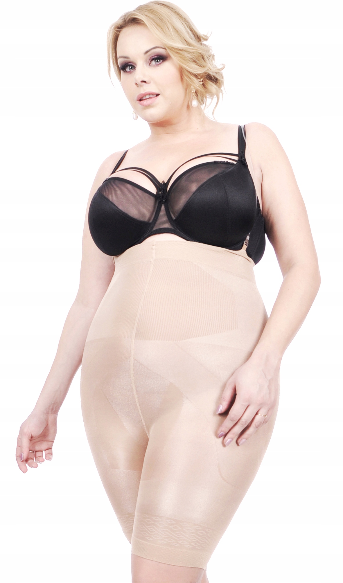 2) Ткань быстро и незаметно прилегает к телу, корректируя (изменивая) фигуру от линии под бюст, через верхнюю и нижнюю часть живота, талии, бедер, ягодиц к бедрам.