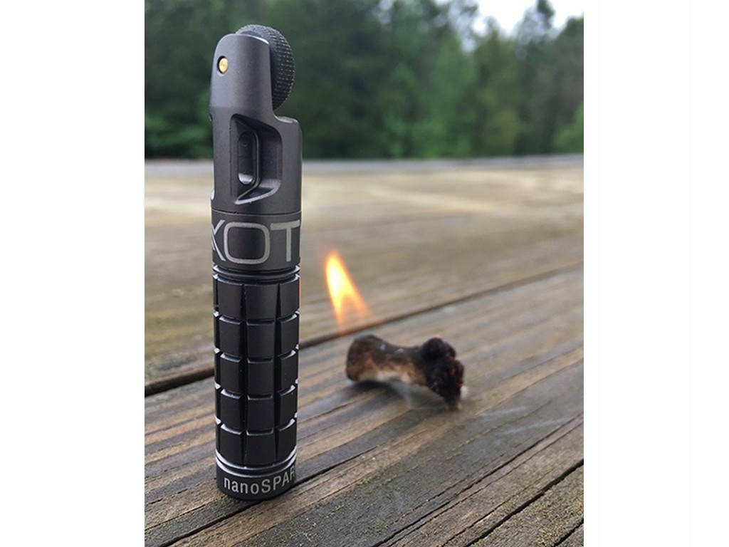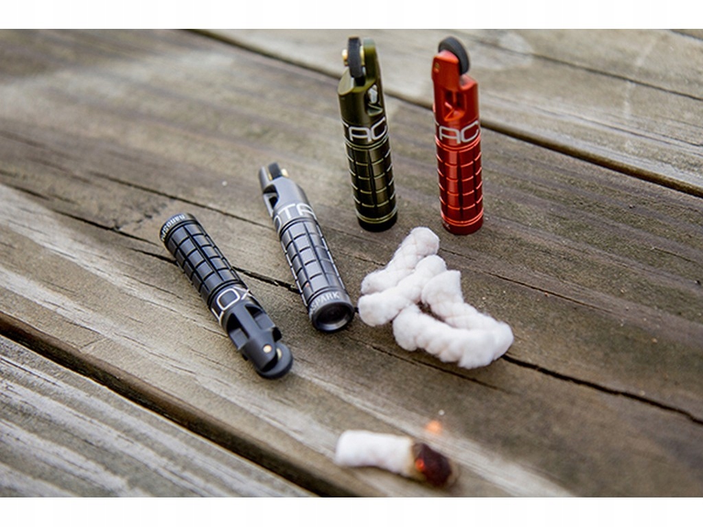 Стартер, изготовленный в США, идеально подходит для любых условий. Набор предназначен для управления одной рукой. Действие кремня похоже на классическую зажигалку — вы поворачиваете кремень, который генерирует искры. Внутри зажигалки находится водонепроницаемый контейнер (глубиной до 1 м), содержащий растопку. Стартер изготовлен из алюминия класса 6061.