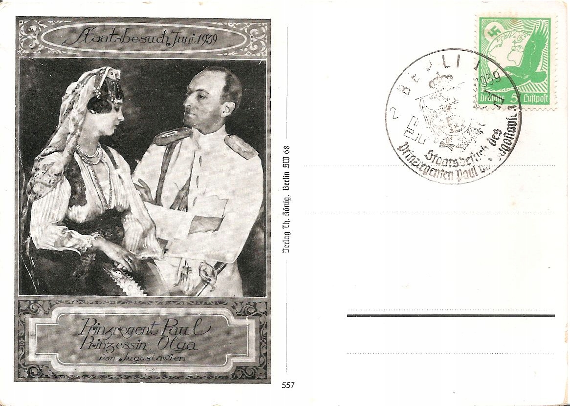 TRZECIA RZESZA -postkarte -JUGOSŁAWIA -1939 rok -wizyta książęca -stempel