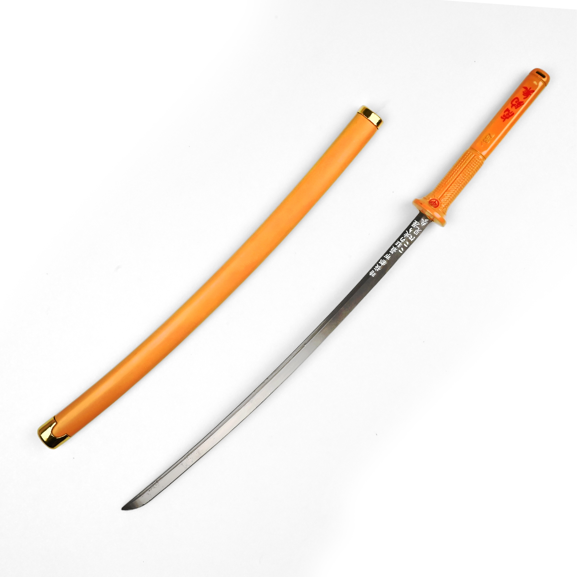 из твердого металла катана отражает высокий стиль оружия, используемый Джуди Альварес. Ручка покрыта интенсивным оранжевым цветом с текстурированной рукой, а красный кандзи дает весь характер и контекст. Клинок сияет с серебряной отделкой с гравированными знаками и японским текстом, который подчеркивает его футуристический характер. Золотые акценты на JELC и вагинальных концах добавляют элегантность, и все дополняется соответствующим оранжевым влагалищем, создавая равномерную и стильную композицию.