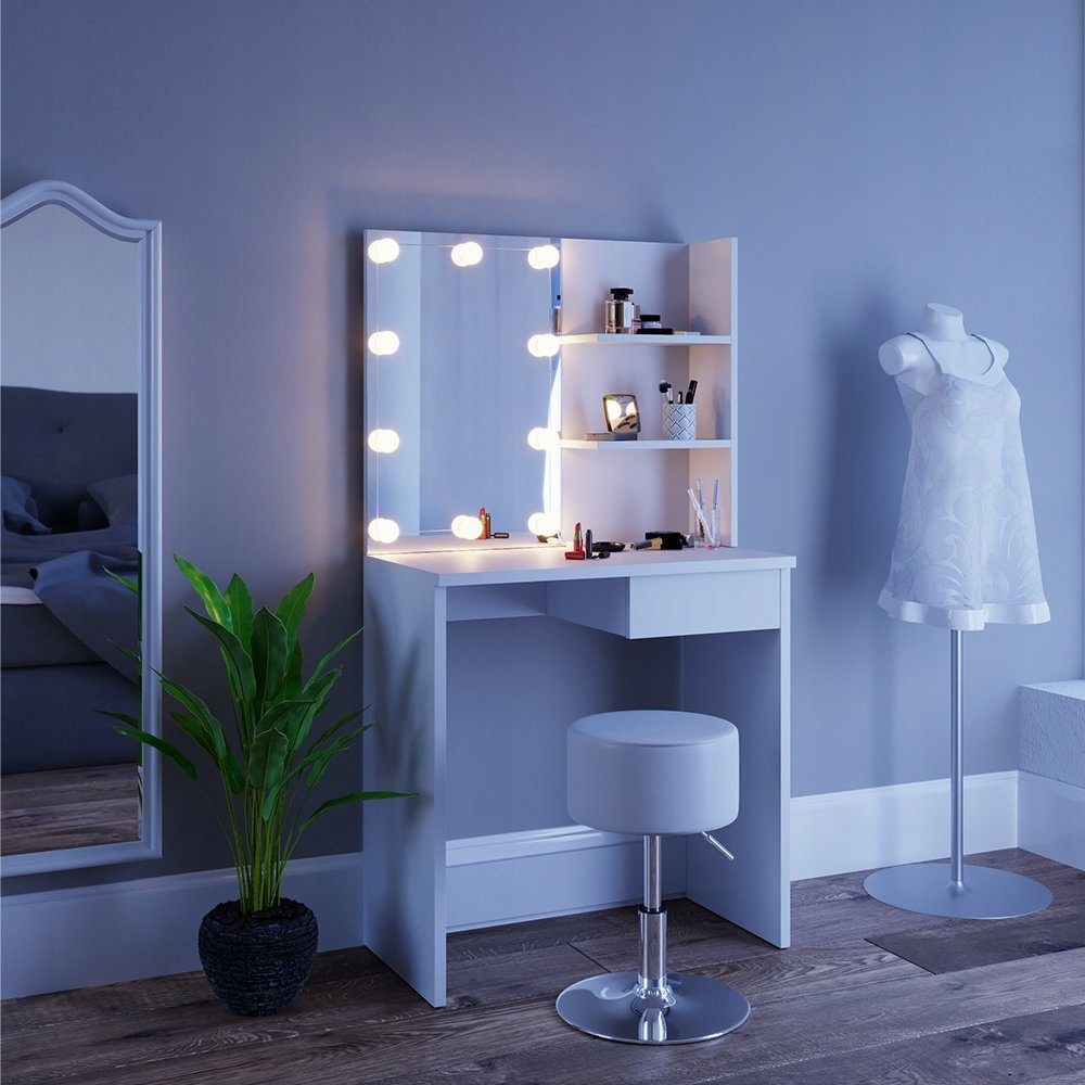 ⚡Уникальный косметический туалетный столик с табуреткой, большим зеркалом и подсветкой. Сделано и произведено вручную в Польше. Имеет 2 полки и ящик, идеально подходящий для косметики, украшений, посуды и других мелочей. Полки идеально подходят для хранения предметов повседневного пользования, например, крема, контейнера с кисточками для пудры или парфюмерии.