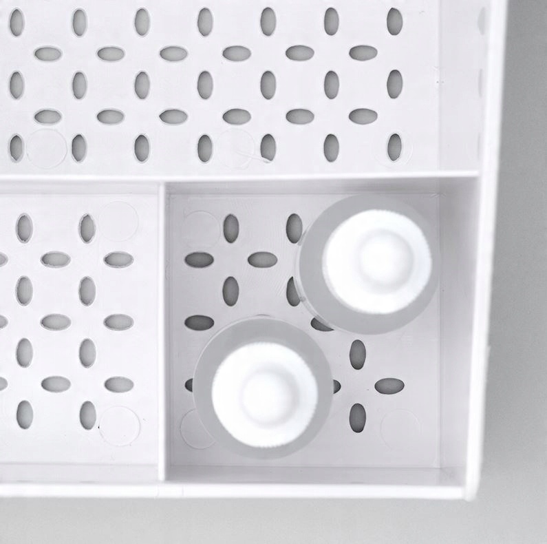 Ажурное дно предотвращает скопление воды на дне органайзера, тем самым предотвращая рост плесени и бактерий.