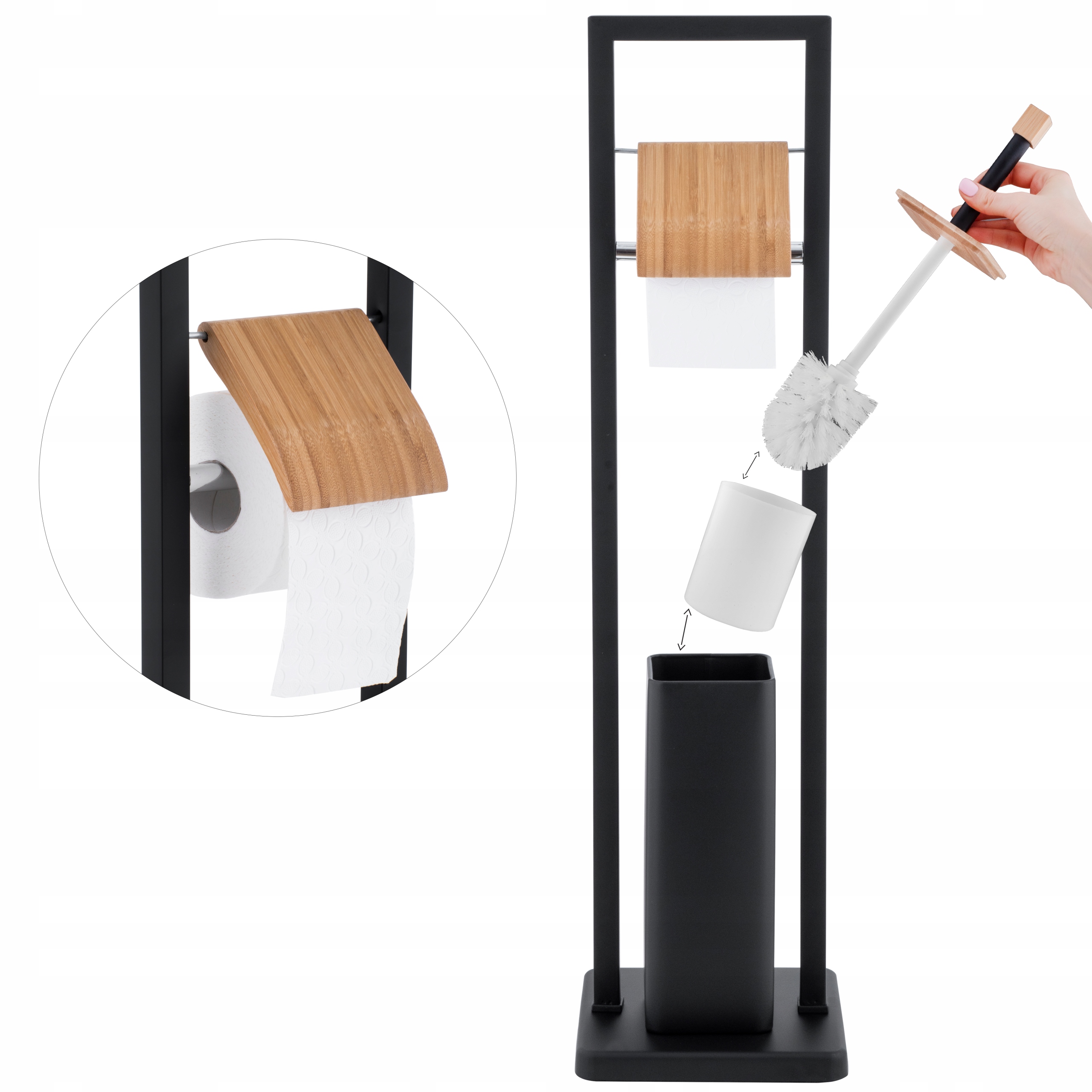 Подставка для туалетной бумаги с ершиком и держателем для туалетной бумаги с клапаном. Изготовлен из высококачественной стали с порошковым покрытием черного цвета. Детали изготовлены из натурального бамбука, устойчивого к влаге. Ершик для унитаза имеет пластиковый контейнер, который защищает от ржавчины и облегчает очистку. Противоскользящее основание обеспечивает отличную устойчивость