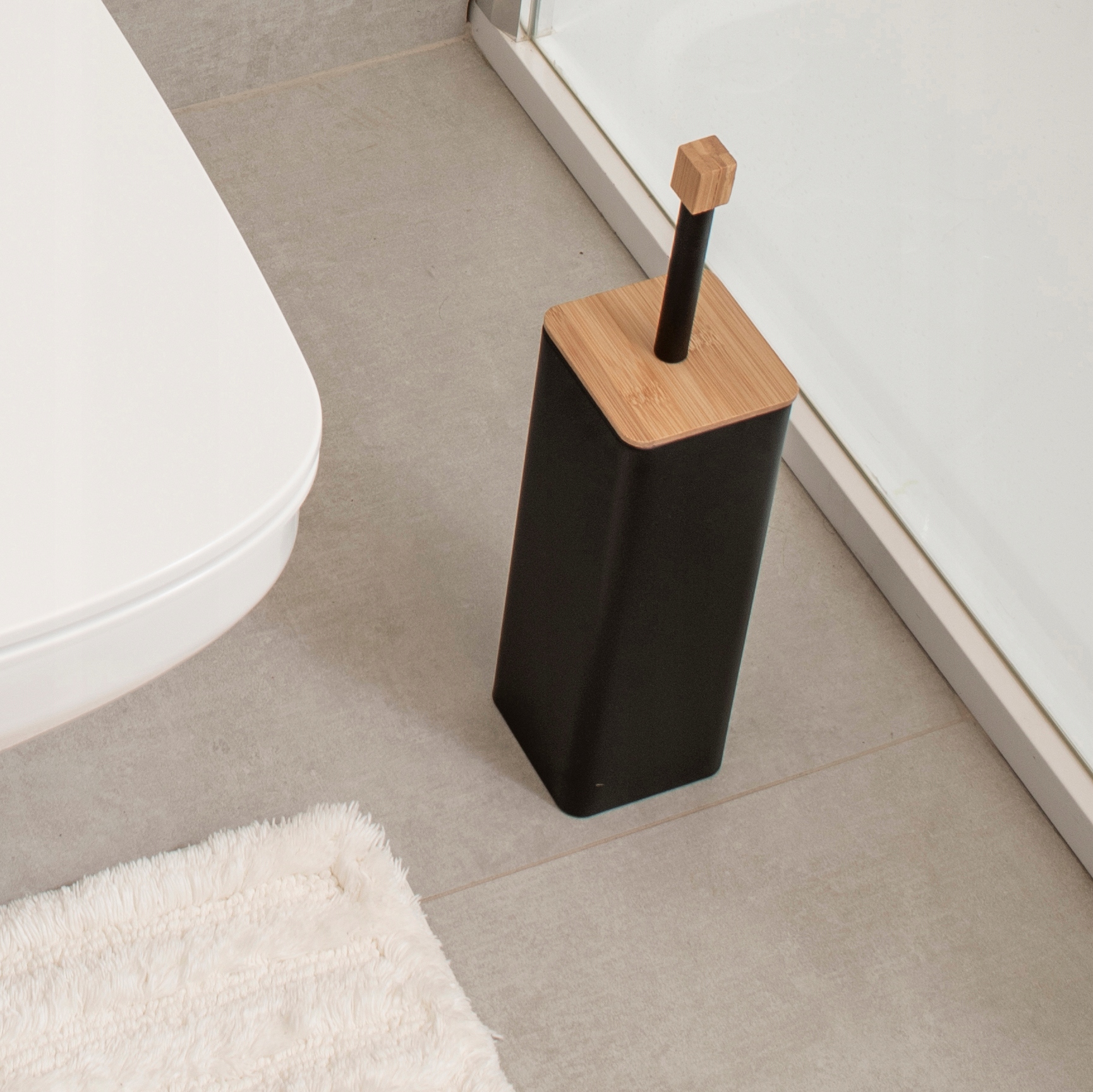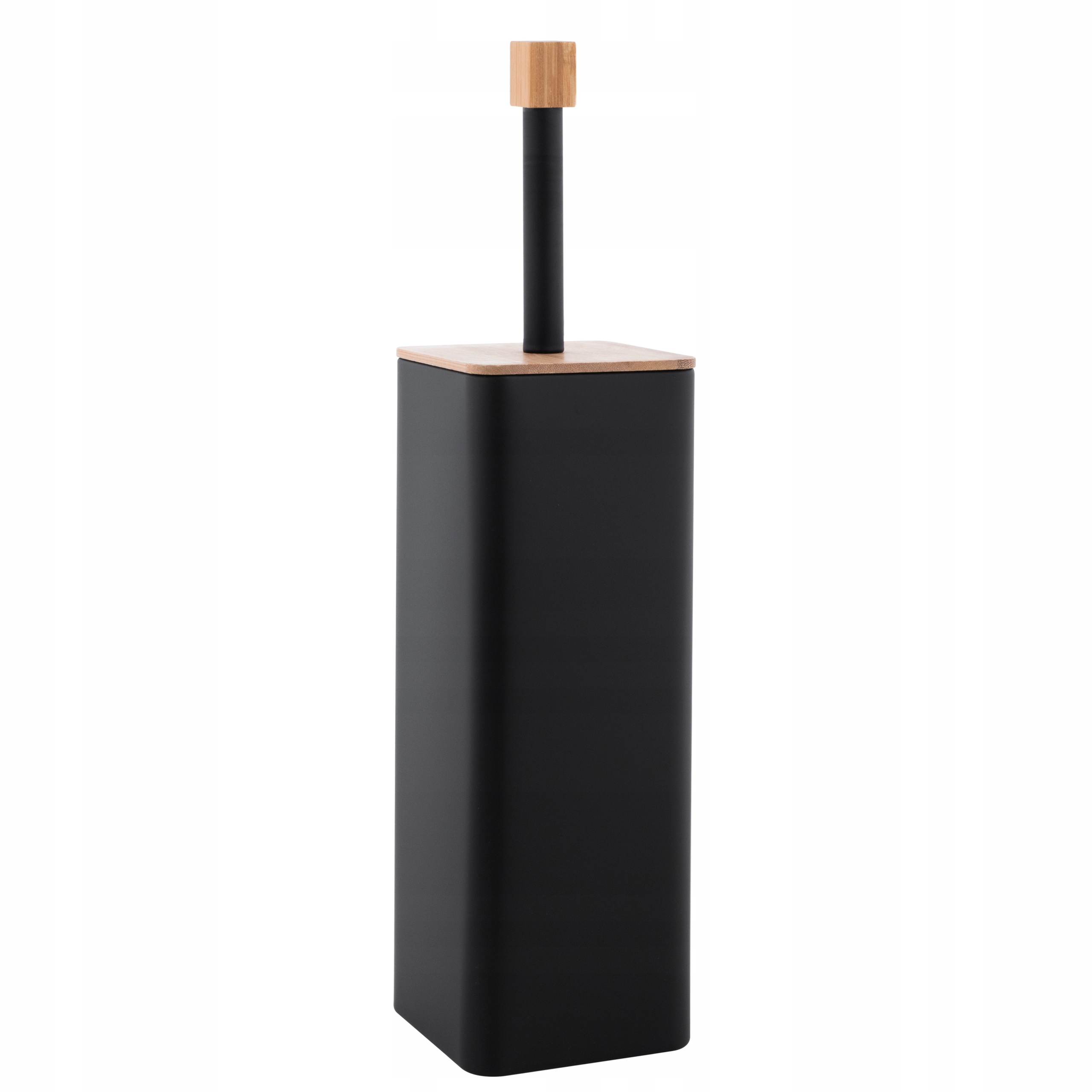 Ершик для унитаза изготовлен из высококачественной стали, окрашенной в черный цвет, с элементами натурального бамбукового дерева.