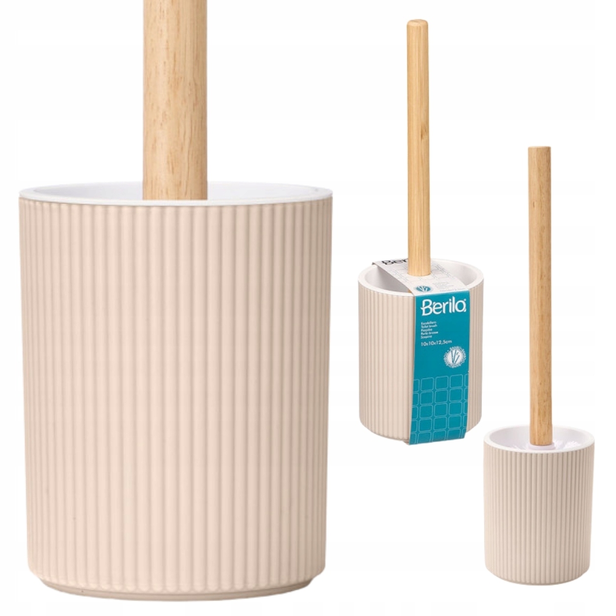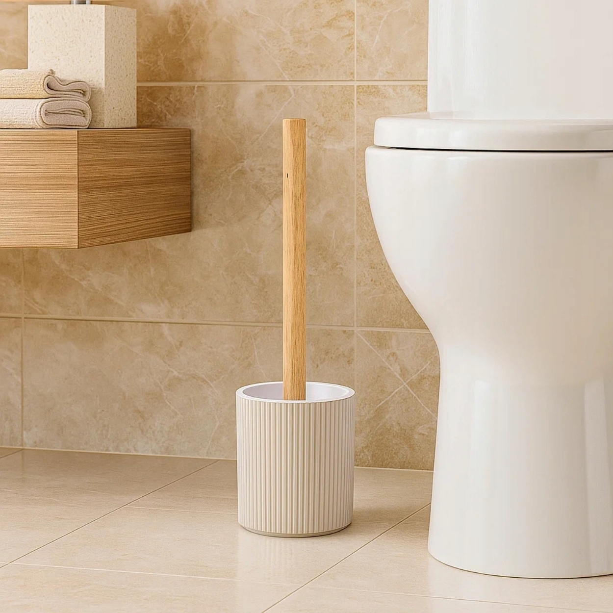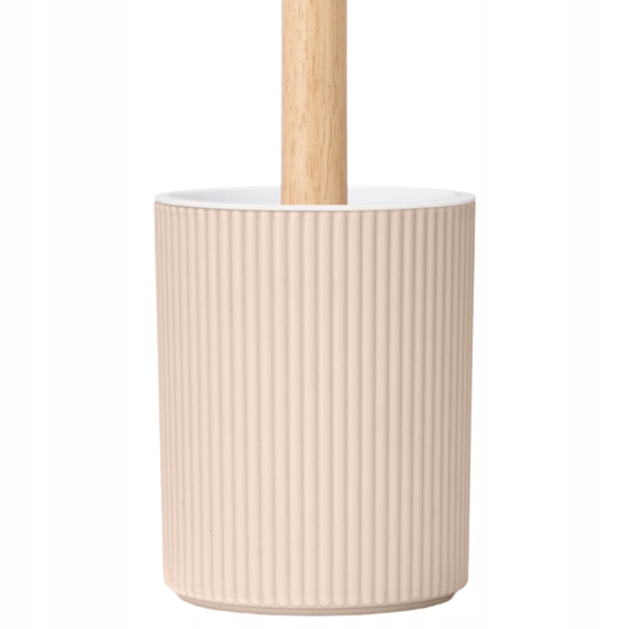 Ершик для унитаза бежевого цвета с рифленым пластиковым контейнером идеально подходит для гигиенической и эстетической уборки в современной ванной комнате.