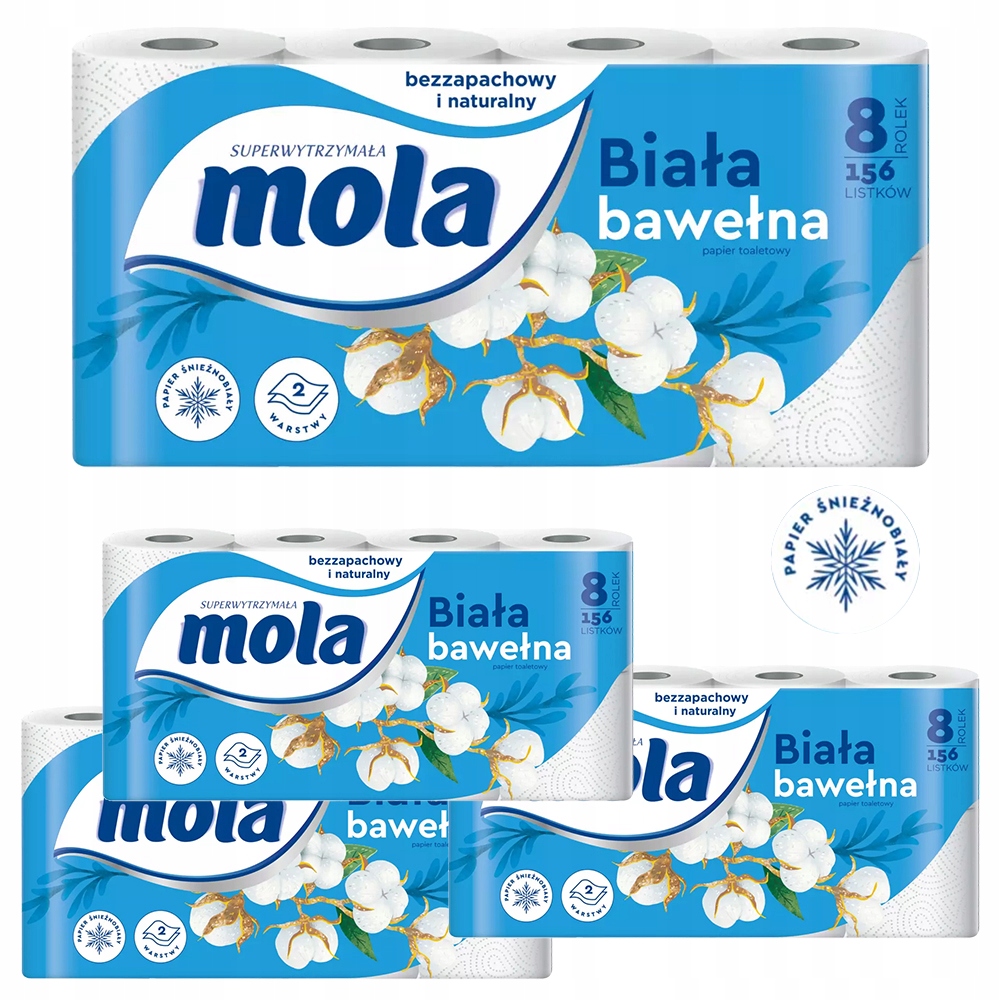 Mola Biała Bawełna — эффективная, впитывающая и прочная, но при этом нежная и мягкая туалетная бумага. Два прочных слоя обеспечат вашей семье комфорт и удобство каждый день. Его уникальная мясистость и мягкость гарантируют удовольствие от использования, не опасаясь истирания, разрыва или потери основных свойств.