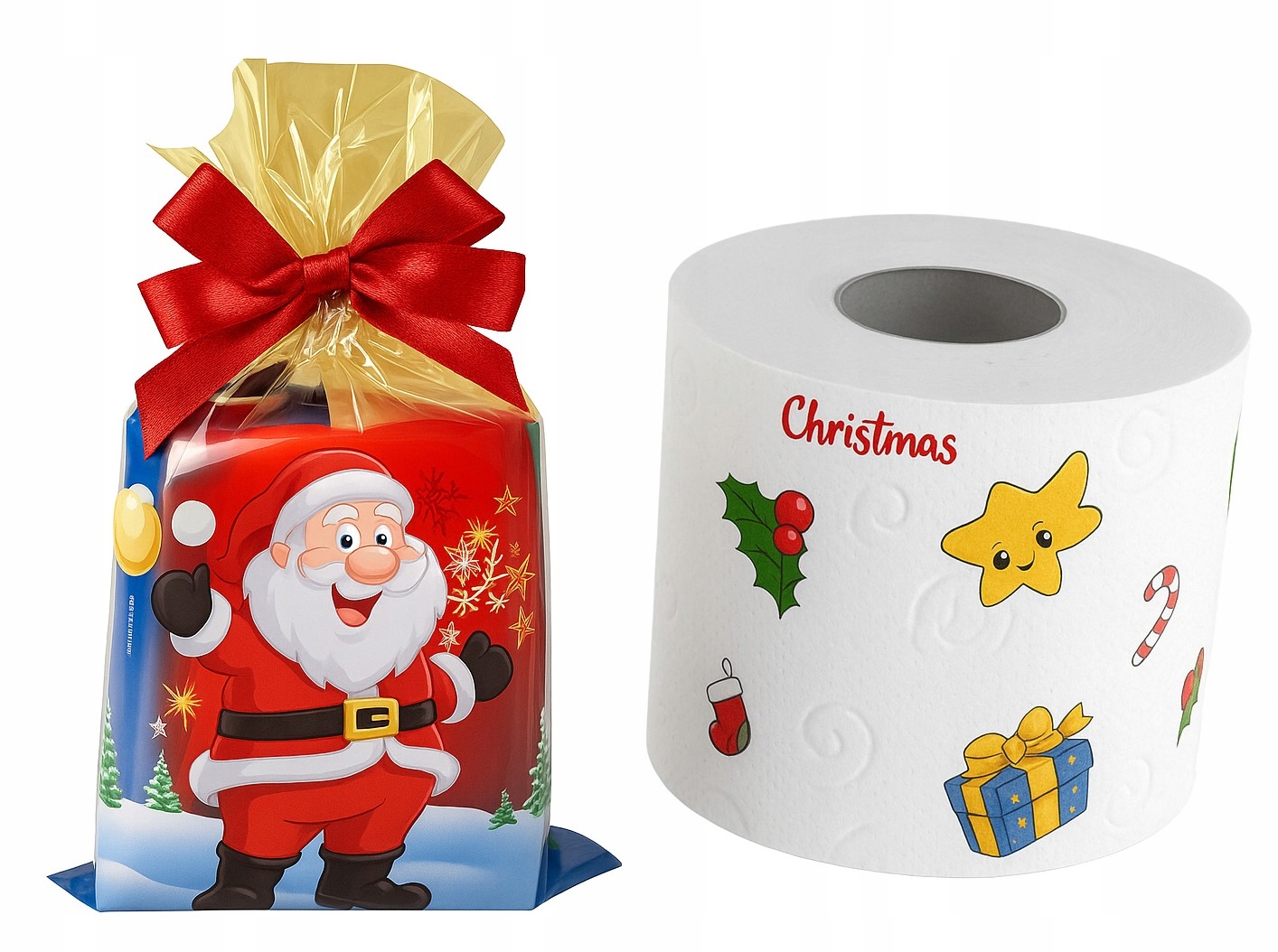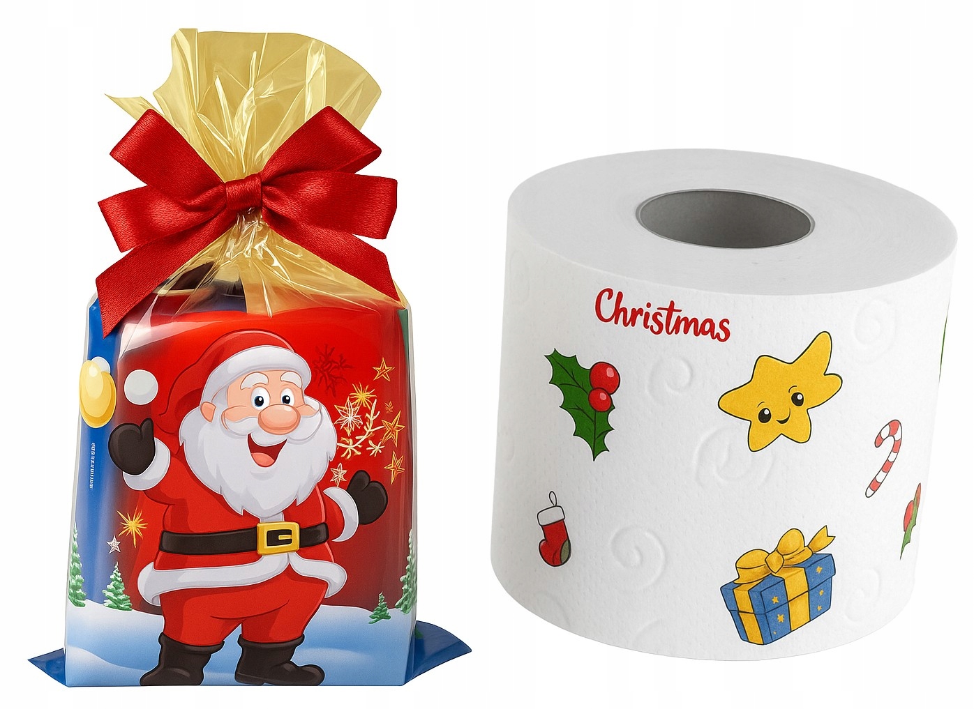 Рождественская туалетная бумага РОЖДЕСТВО с забавным рождественским мотивом, 1 рулон, упакована в декоративный целлофановый пакет Деда Мороза, перевязанный тонкой лентой. Очень хорошая идея для подарка до 5 злотых. Рекомендуем!
