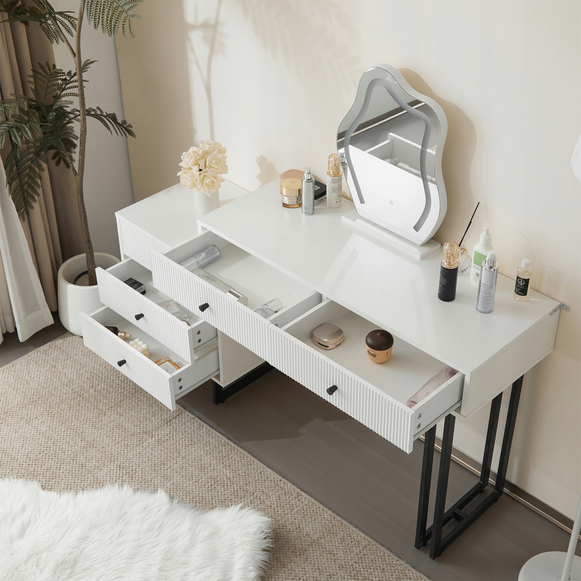 Белый верх и черная металлическая фурнитура в сочетании с волнистый дизайн панелей придает этому туалетному столику современный, стильный и элегантный вид, который легко впишется в ваш интерьер.