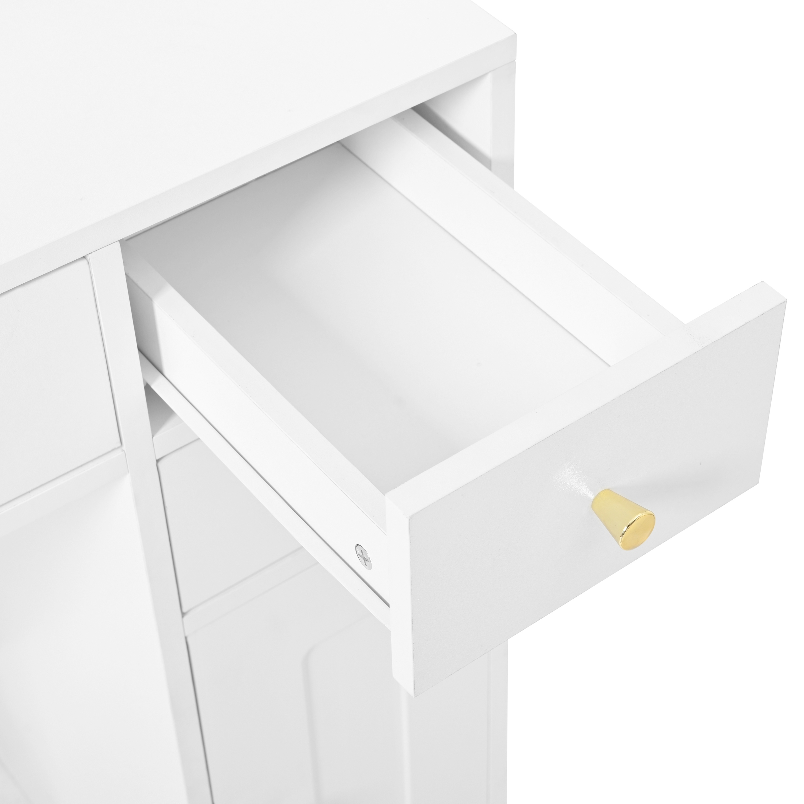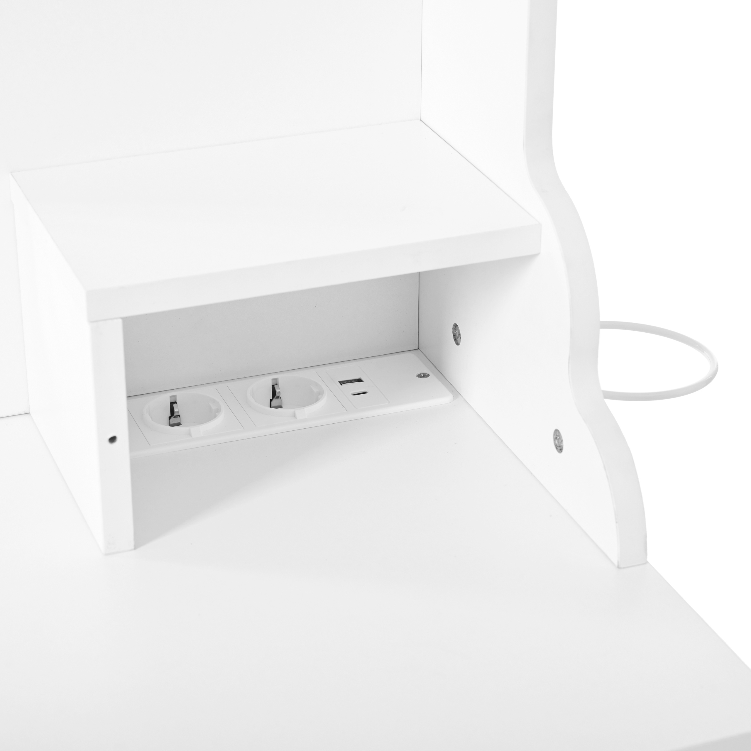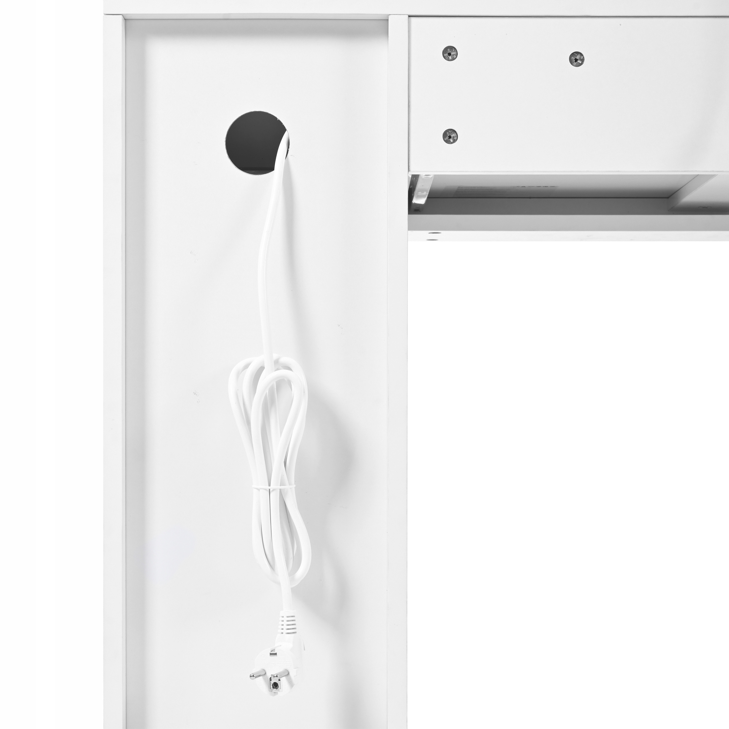- Плюковой столик имеет встроенную полосу мощности с 2 стандартными гнездами, 1 USB -портом и 1 портом типа C. Держатель фен прикрепился к боковой стороне шкафа, чтобы облегчить использование бигуди, косметических устройств и фен.