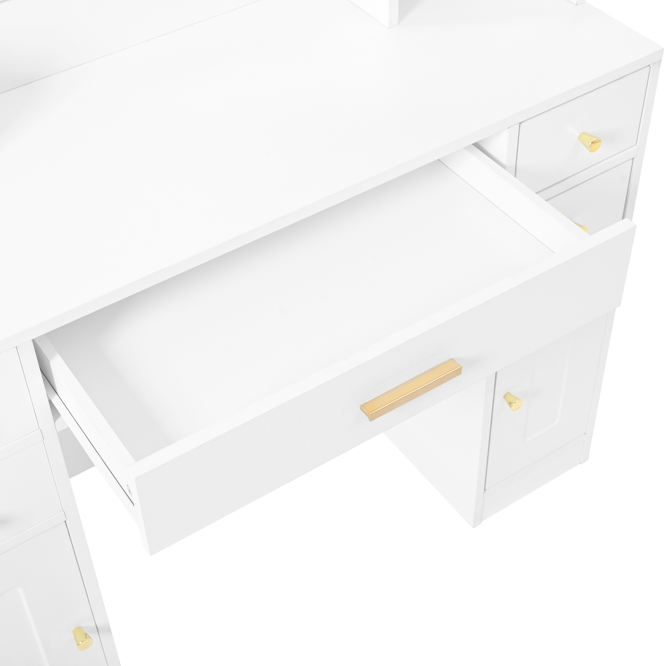 Большой туалетный столик с регулируемым светодиодным освещением и электрическими гнездами, туалетным столиком с зеркалом, 6 ящиками и 4 -спальными дверями, белыми, размерами 105 × 152 × 40 см (ширина × высота × главная)