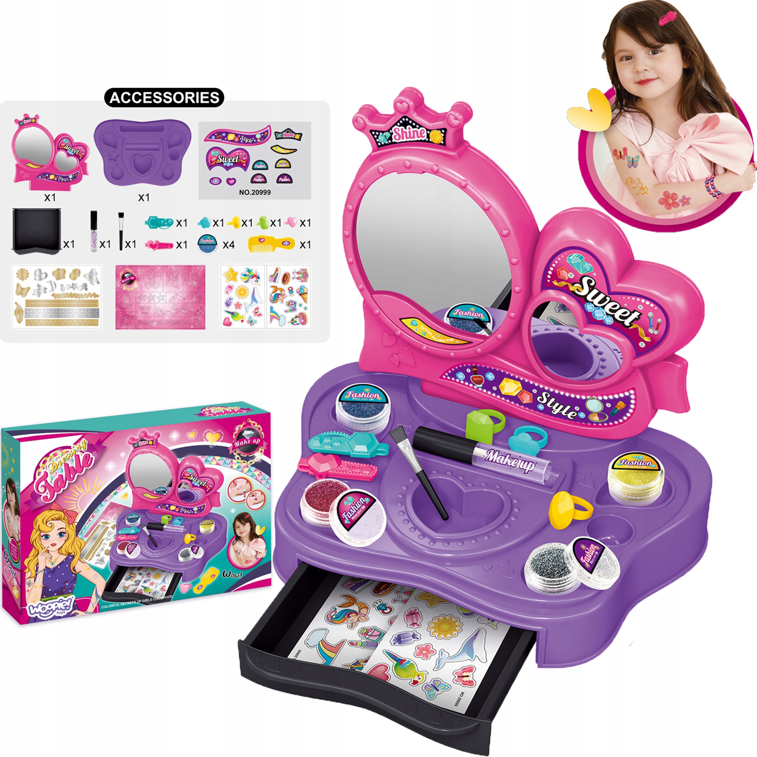 Туалетный столик 2 в 1 для студии макияжа от бренда WOOPIE познакомит девушек с миром мода и позвольте им создать свой собственный стиль! Набор выглядит как в настоящем салоне красоты. В комплект входят: туалетный столик, 4 рассыпных блестки, 2 комплекта наклеек и татуировок, лак, кисть, кисточка, 2 зажима и 4 кольца. Просто нанесите наклейки/татуировки и посыпьте узоры блестками и все готово! Набор 100% безопасен для детей. Набор развивает первые интересы, ручные навыки и, прежде всего, воображение и творческие способности. б> в создании неповторимого стиля!