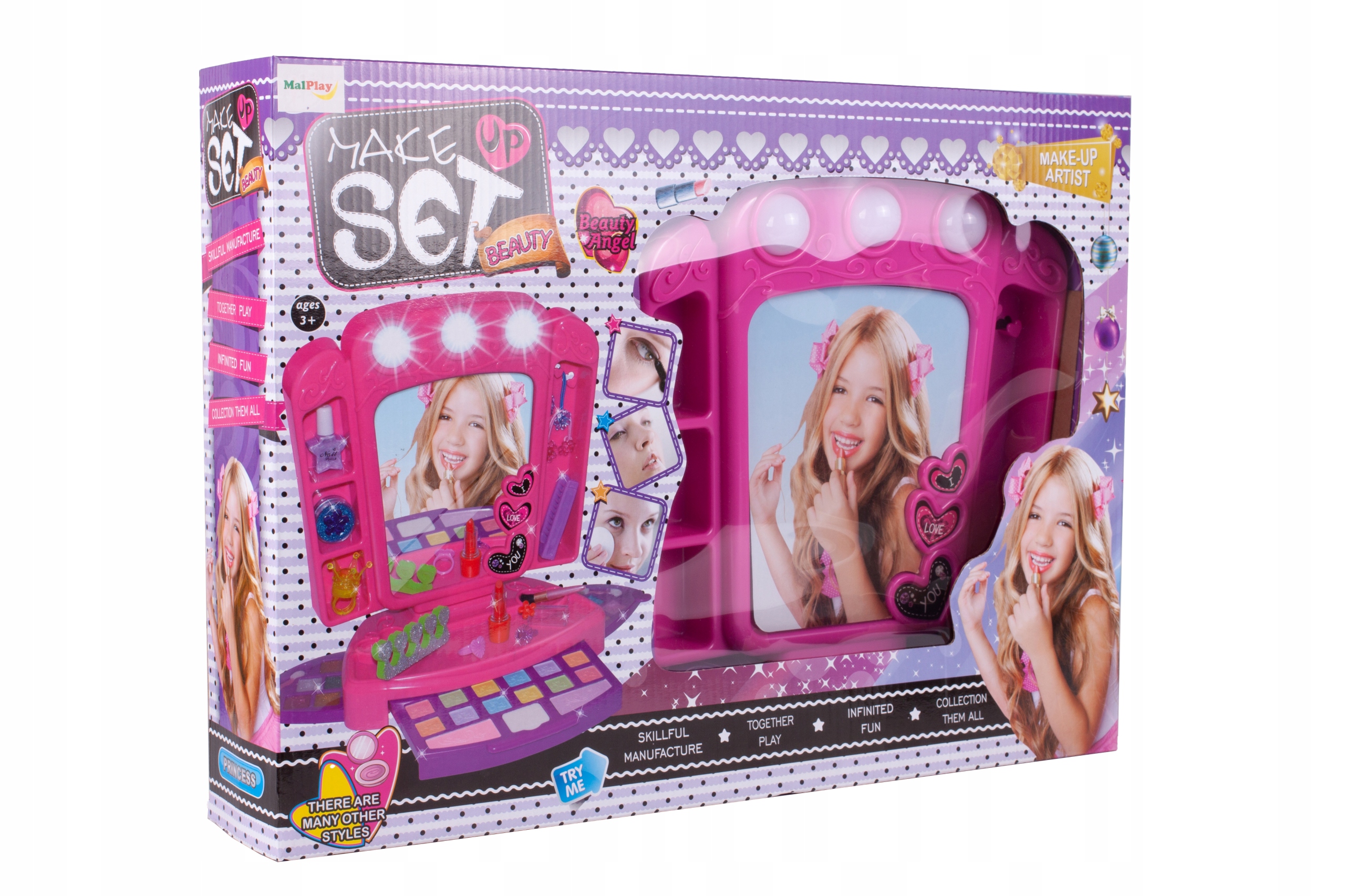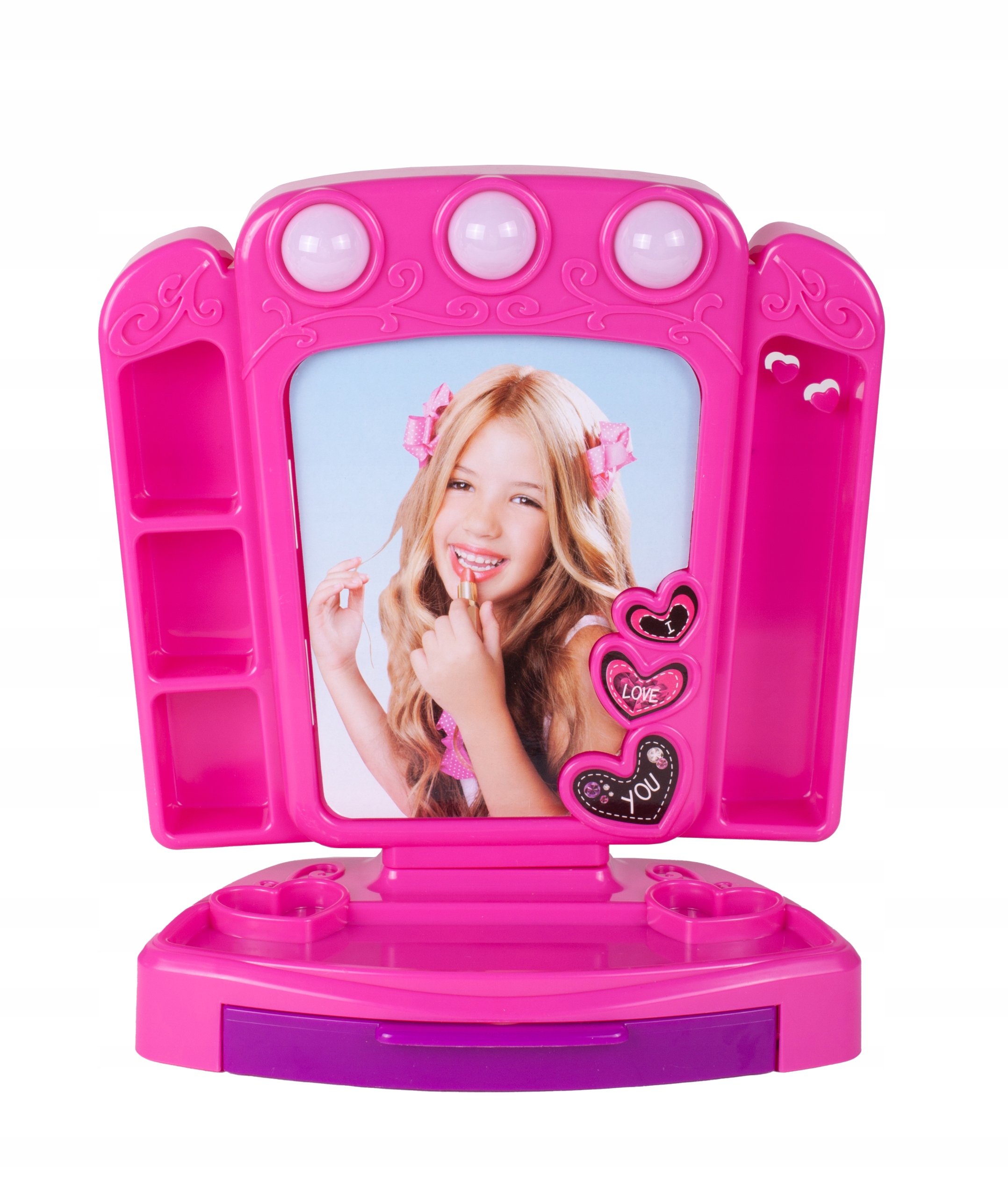 Блестящее зеркало со светодиодной подсветкой и множеством ящиков для аксессуаров перенесет вас в волшебный мир. Набор косметики, позволяющий стать настоящим визажистом и создать гламурный образ. Набор для модных девушек, благодаря которому они смогут сделать свой первый макияж самостоятельно.