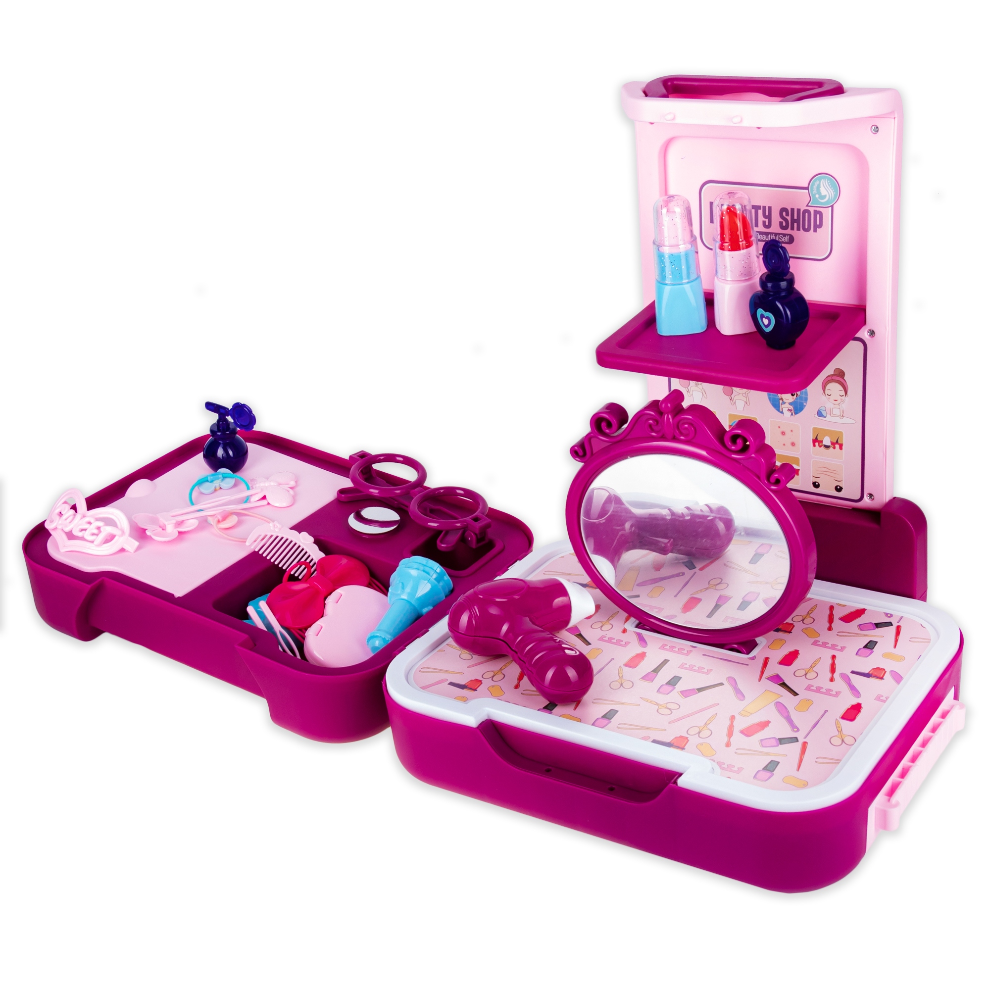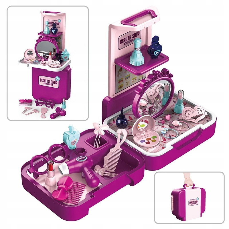 Все это упаковано в красочный, удобный чемодан 3-в-1, который привлечет внимание не только самых маленьких. Вы можете превратить его в туалетный столик или в портативный салон красоты. Сборка очень простая.