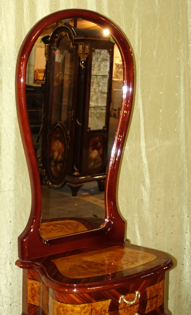 Предмет мебели восхищает своей уникальностью. Он новый и сделан из дерева, чтобы выглядеть как старый, исторический. Зеркало в стильной овальной раме. Стол и зеркало цвета темного ореха, раскрашенные вставками, оригинальным капом ореха и латунными ручками на ящиках. Консоль стоит на стильно изогнутых ножках, соединенных внизу практичной полкой. Два ящика под столешницей. Все это создает неразрывную гармонию.