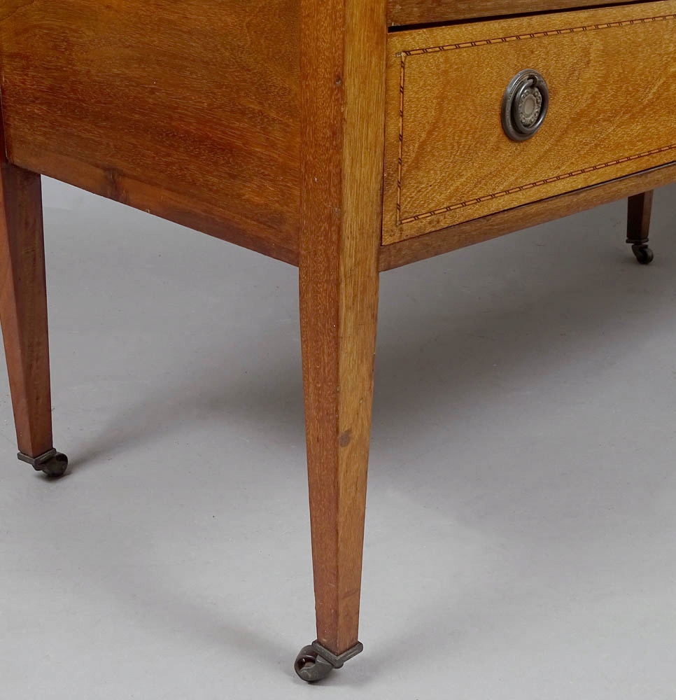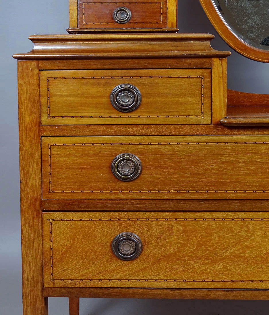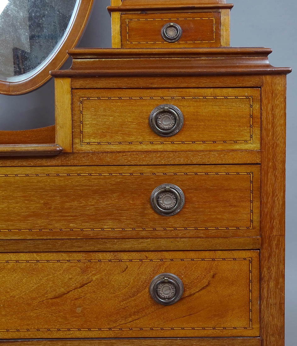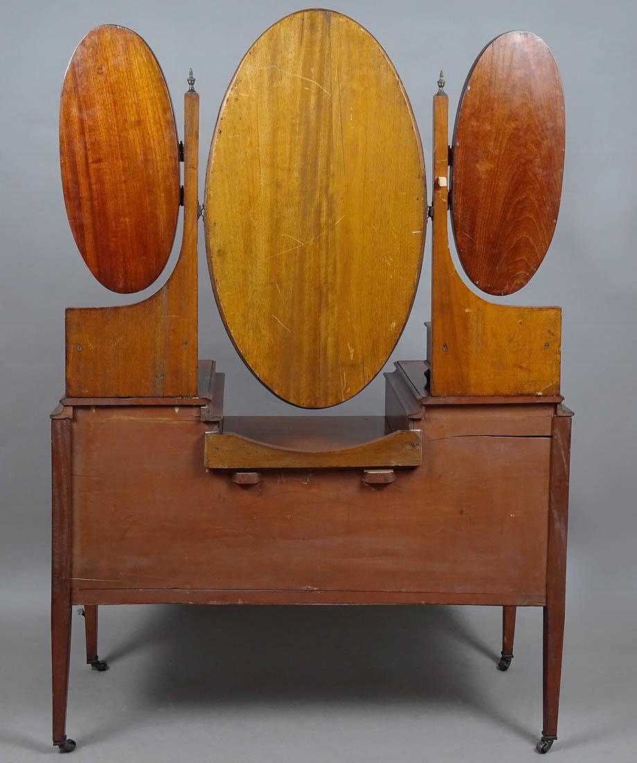 с простой базовой дизайном и наклонной настройкой с тремя овальными зеркалами. Целое поддерживается на четырех хребтах, суженных ногах, заканчивается латунными роликами. В Оскрине два больших ящика и две меньшие мебели по бокам мебели, с тонкими вставками на лице и медными ящиками. Вверху по бокам два наименьших ящика одинаково украшены, над ними овальные плитки зеркала канала, расположенные в линии из линии по всему периметру, наклоненные вбок. Центрально расположенный крупный, также овальный, очарованное зеркало, наклоненное вертикально, украшенное как два меньших.