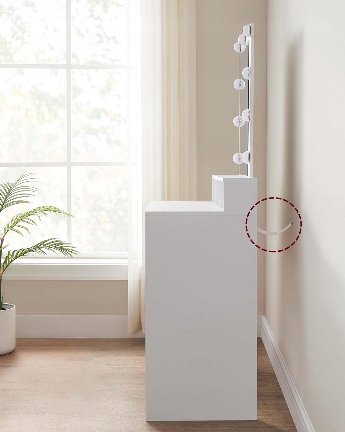 Элегантный туалетный столик с зеркалом, затемненным освещением и вместимыми ящиками.