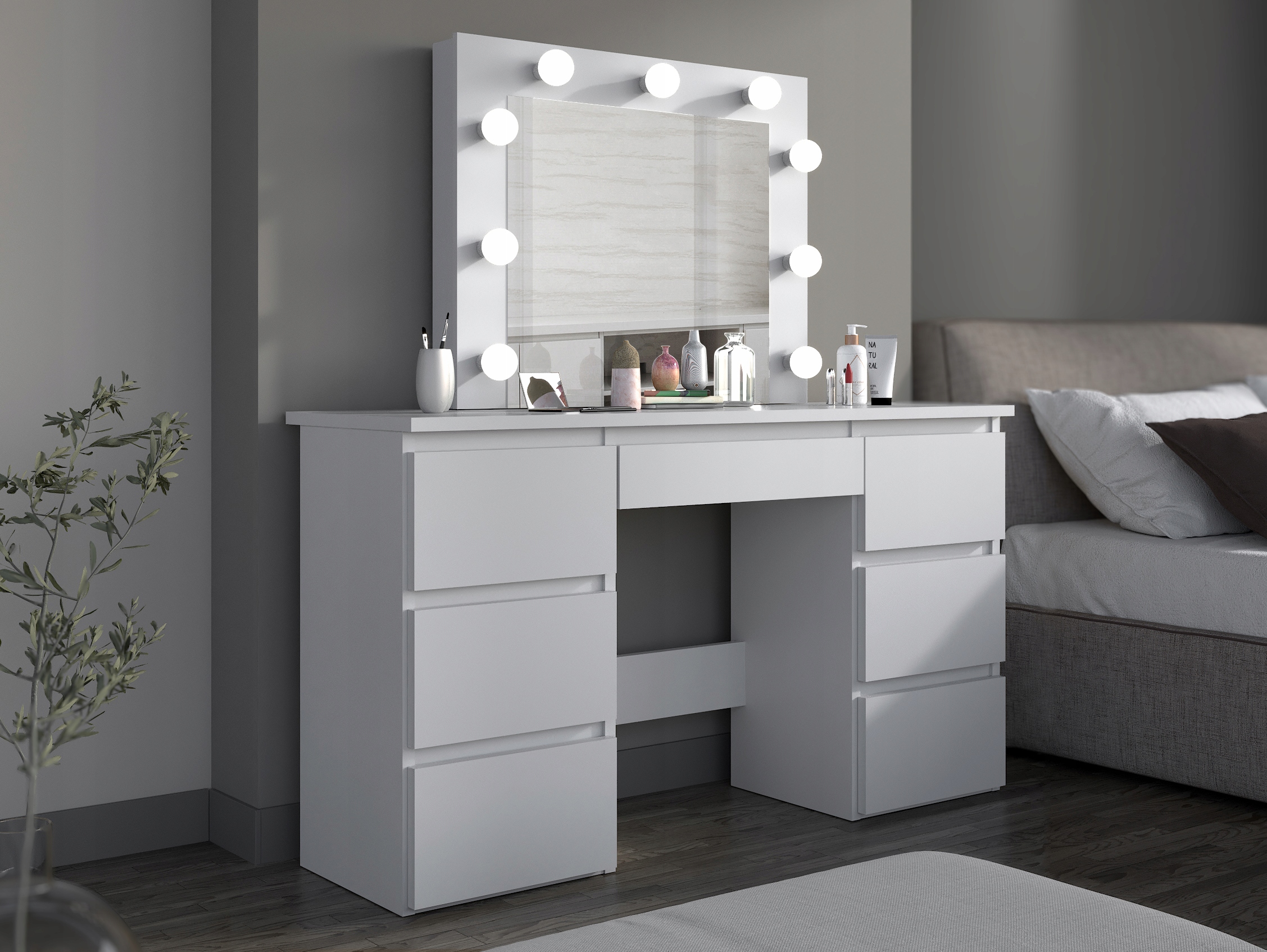 Туалетный столик с зеркалом, подсвеченным 9 лампочками, – идеальное место для ежедневный уход и подготовка. Оснащенный 7 ящиками, он предлагает достаточно места для хранения косметики и аксессуаров. Благодаря гармоничному сочетанию функциональности и элегантности этот туалетный столик станет центром вашего косметического пространства.