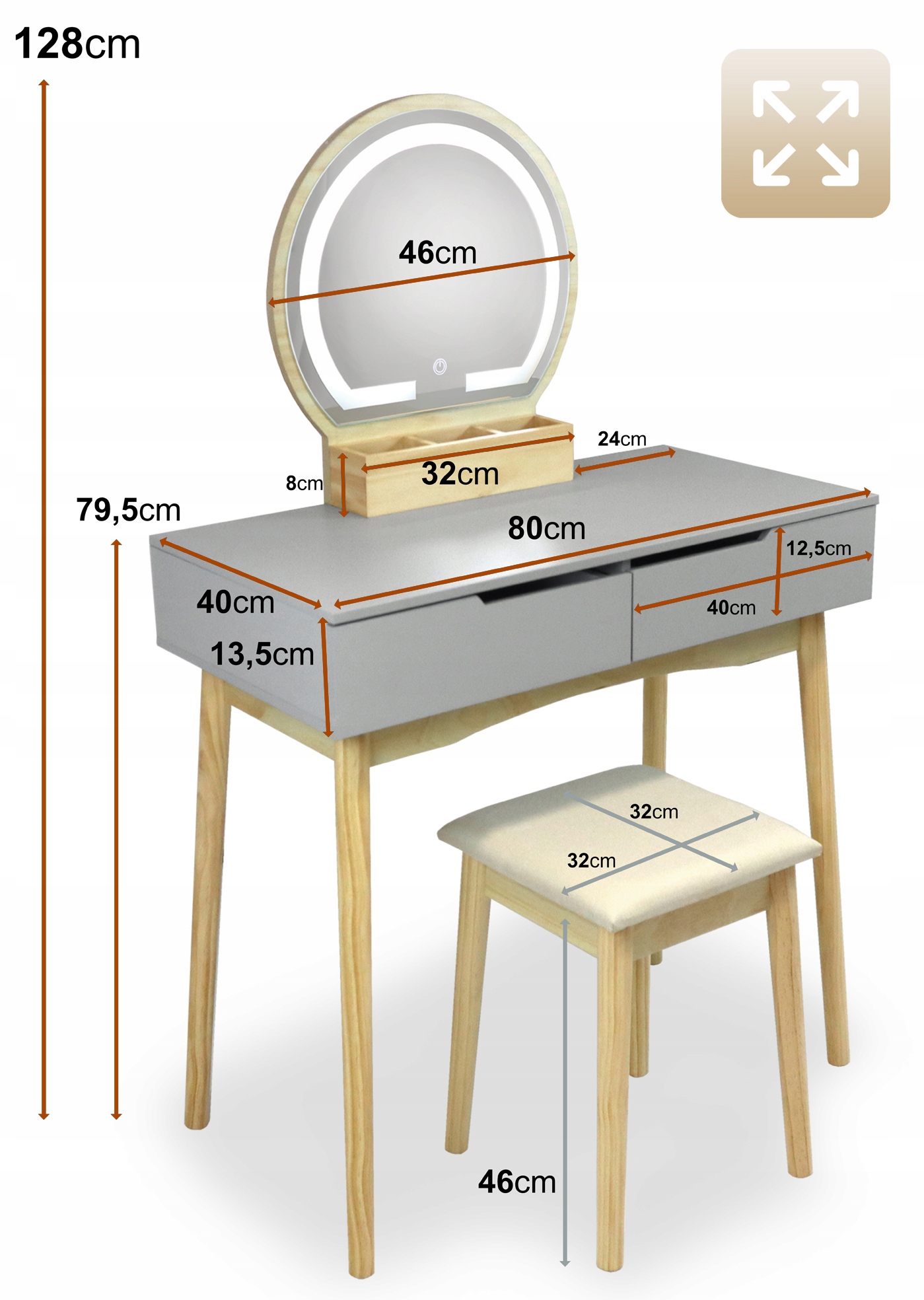 ТУАМЕТНИК з ДЗЕРКАЛОМ і ТАБУРЕТОМ, дерев'яний, світлодіодне освітлення, сірий КОСМЕТИЧНИЙ