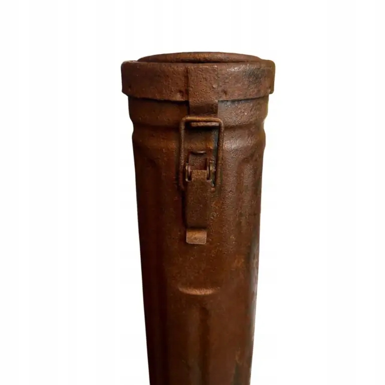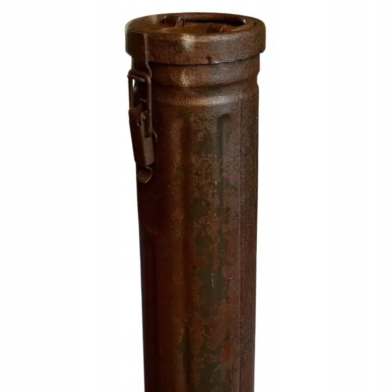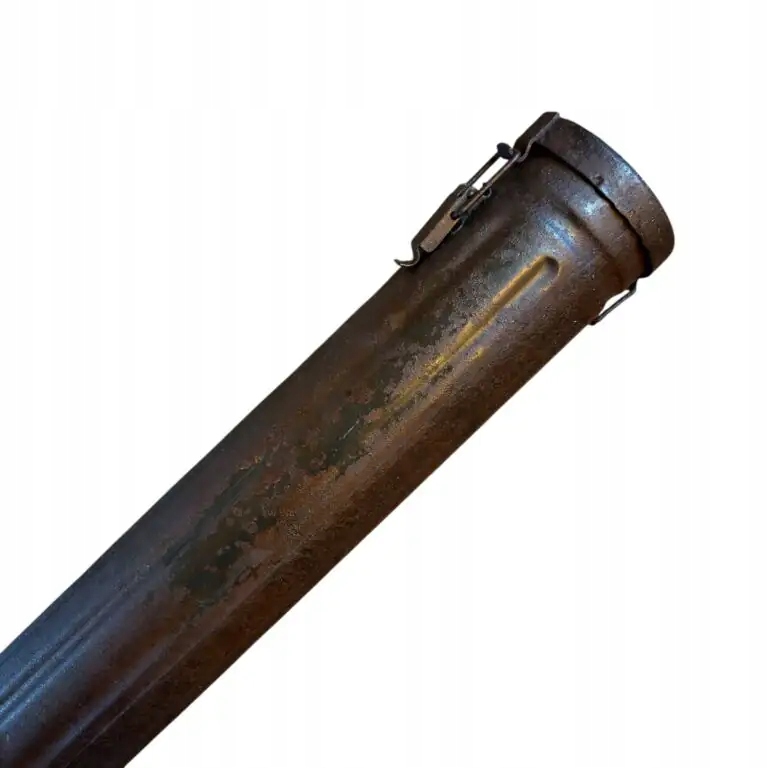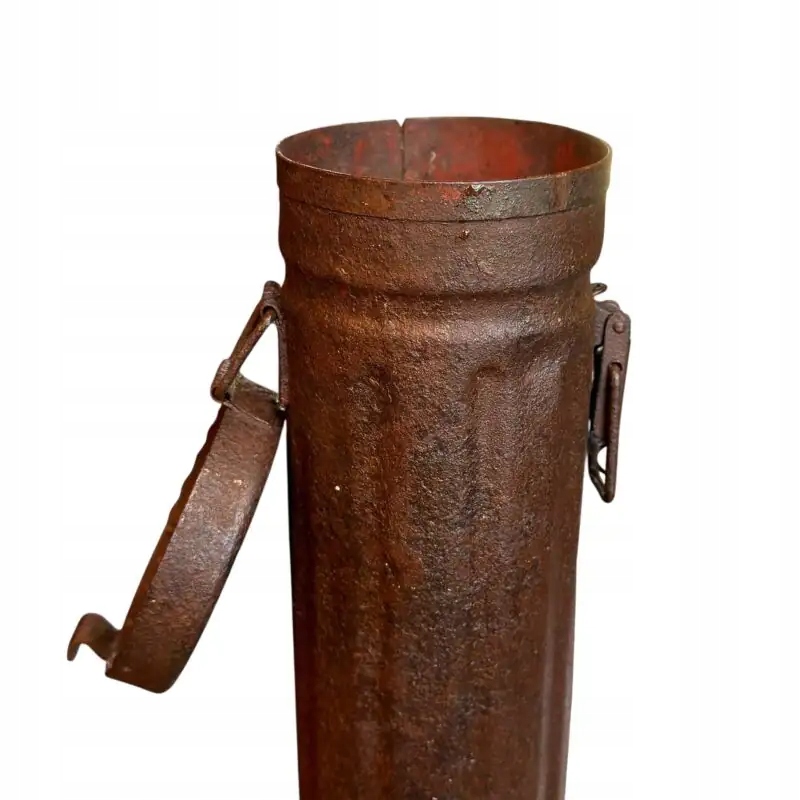 Немецкая трубка для танкового снаряда KwK 40, трубка для снаряда для пушки KwK 40 7,5 см, используемая в том числе в PzKpfw IV, а также в Sturmgeschütz III и Sturmgeschütz IV, использовались две модели этой пушки, более короткая и длинная, этот контейнер предназначен для боеприпасов к более длинному орудию, Контейнер в хорошем состоянии, внутри прекрасно сохранилась немецкая красная мини-краска/грунтовка, остатки планок, ручка, петля, застежка функциональные, на внешней стороне тюбика остатки краски Фельдграу, Длина 104 см, диаметр 10 см