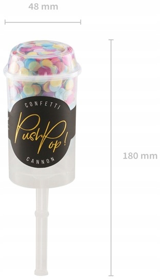 - ▶ ️ конфетти, запущенный вручную, используя поршень (мышечная сила) -> сначала удалите крышку контейнера, стараясь не пролить конфетти из трубки. Направьте трубку в выбранное направление и энергично приклеивайте палку рукой - это позволит вам запустить конфетти. Трубка многоразовая, просто купите на другом нашем аукционе Confetti, и вы сможете снова насладиться Push Pop Tube.