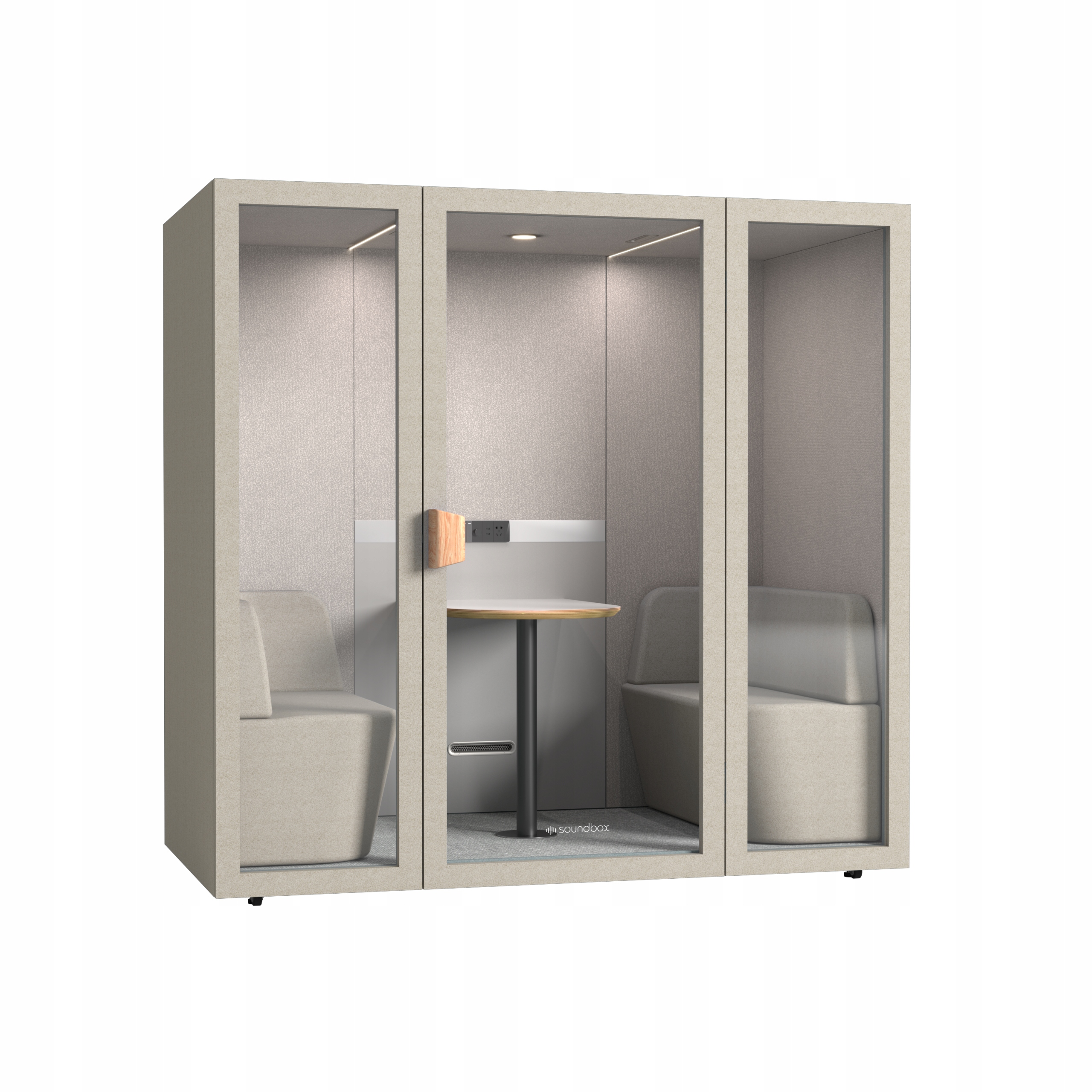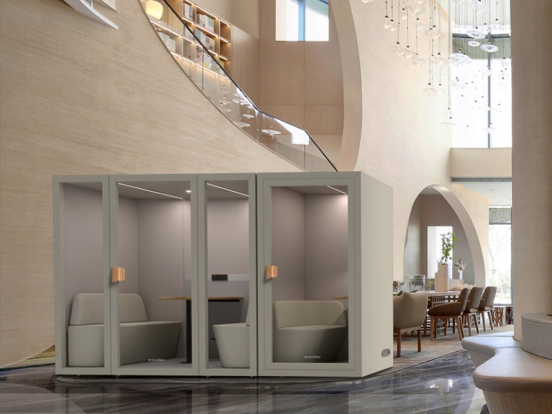 Современная звукоизолирующая акустическая кабина – абсолютный must-have в современных интерьерах офисов открытого типа, офисов, аэропортов, отелей и университетов. Кабина позволяет вести телефонные переговоры или телеконференции в комфортных условиях, где вы можете сосредоточиться на разговоре и вести его, не мешая коллегам. Акустическая кабина на четырех человек представляет собой удобное, хорошо изолированное место для деловых встреч или обучения. Стеклянные двери делают кабину чрезвычайно светлой и украшают интерьер, в котором она находится. Удобная и практичная акустическая кабина будет хорошо работать в современном офисе, отличающемся инновациями. Кабина изготовлена из высококачественного сырья, обеспечивающего достаточную звукоизоляцию. Внутренний дизайн и отделка позволяют использовать это комфортное место всякий раз, когда вам это необходимо.