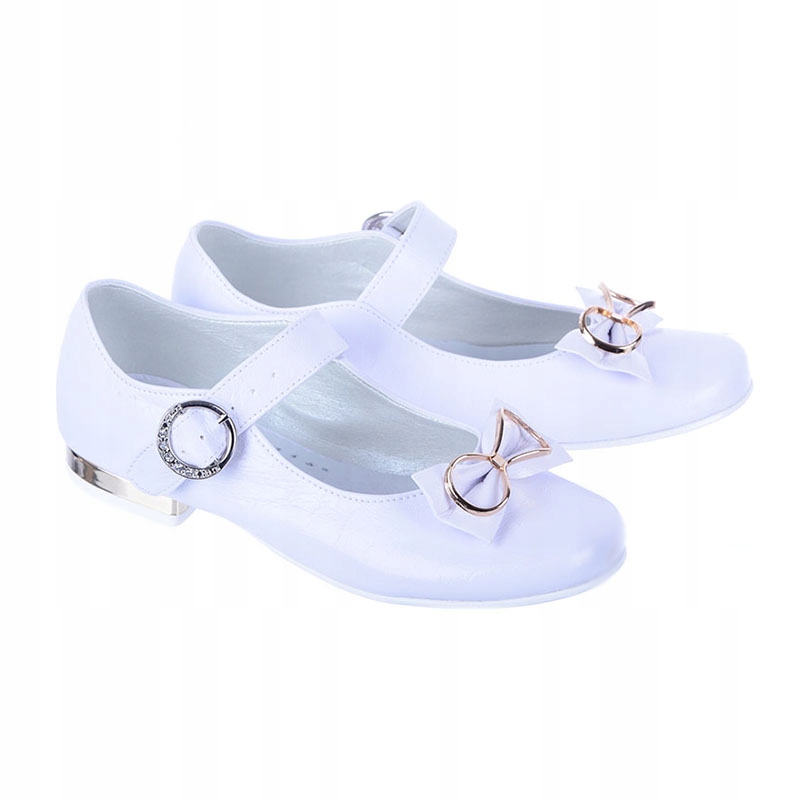 Красивые туфли для первого причастия, удобные туфли-лодочки/балетки для причастия. Верх выполнен из экологической кожи. Обувь также имеет кожаную профилированную стельку. Легкий, очень удобный! Сделано с вниманием к деталям. Туфли на белом, невысоком каблуке с золотой вставкой. Украшен элегантными белыми бантами с привлекательной пряжкой. Они идеально подходят для торжественных случаев. Продукт полностью изготовлен в Польше компанией MIKO