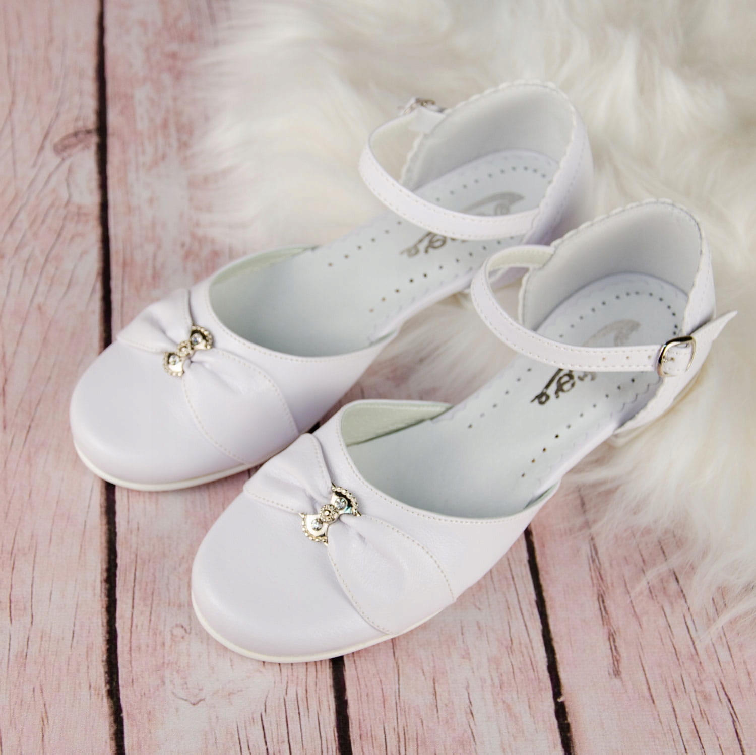 Классические белые туфли для причастия для девочек, застегиваются на регулируемый ремешок с пряжкой. Ботинки имеют правильную форму, поэтому надежно сидят на ноге. Модель имеет изящный каблук высотой 1,5 см, серебристого цвета. Красивое украшение на передней части верха добавляет им очарования. Внешняя часть обуви изготовлена из экологической кожи, а пятка и стелька – из натуральной кожи.