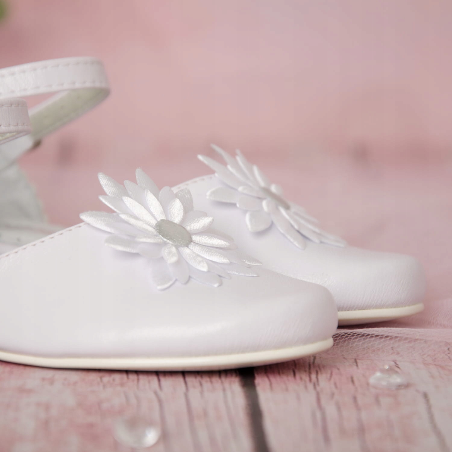 Элегантные белые туфли для причастия для девочек. Модель с застежкой и регулируемым ремешком. Обувь имеет правильную форму, что делает ее очень удобной. Модель на тонком каблуке высотой 2,5 см, белого цвета. Белый цветок добавляет им очарования. Классическая модель, которая подойдет к большинству платьев и альбомов. Внешняя часть обуви изготовлена из экологической кожи, а пятка и стелька – из натуральной кожи.
