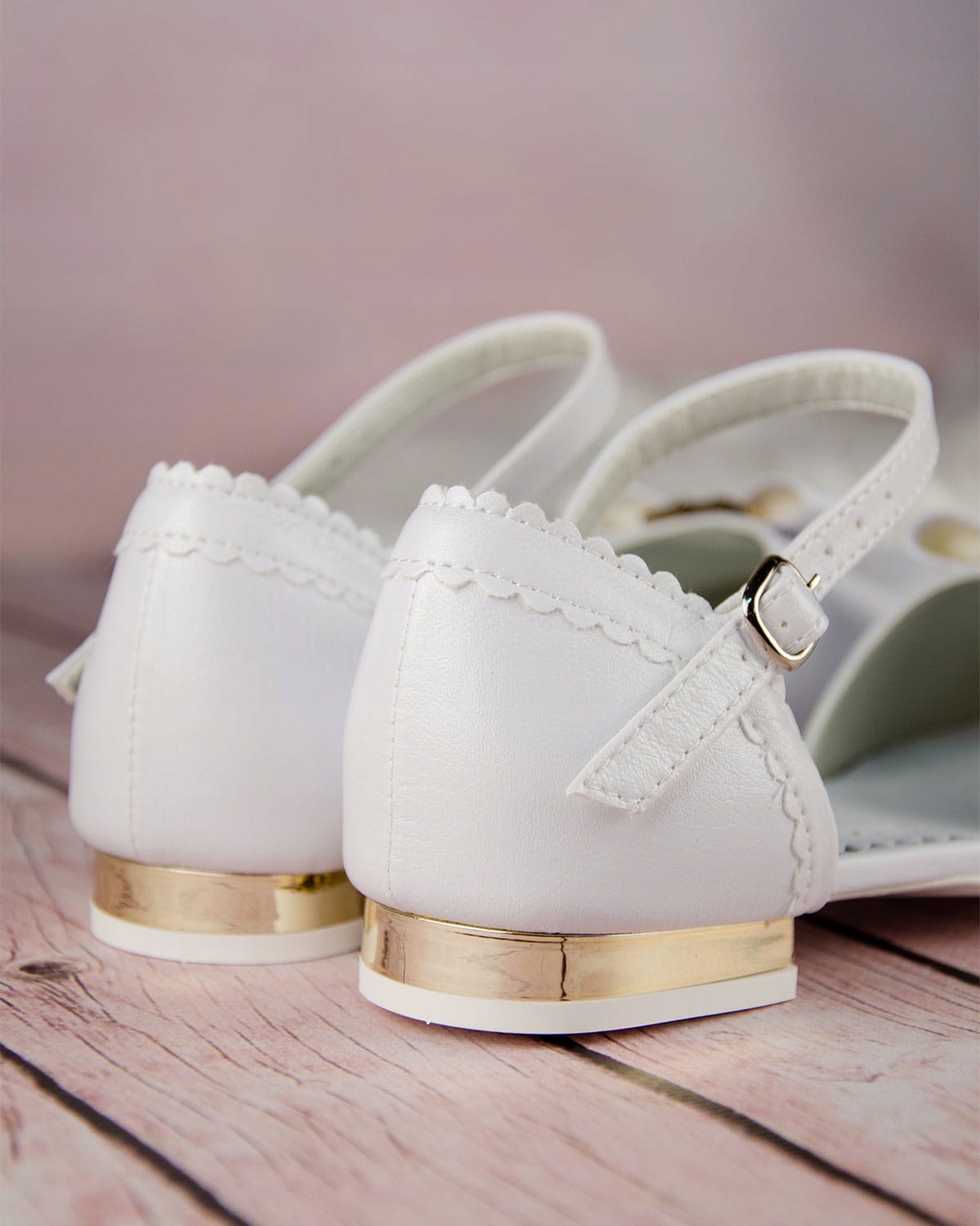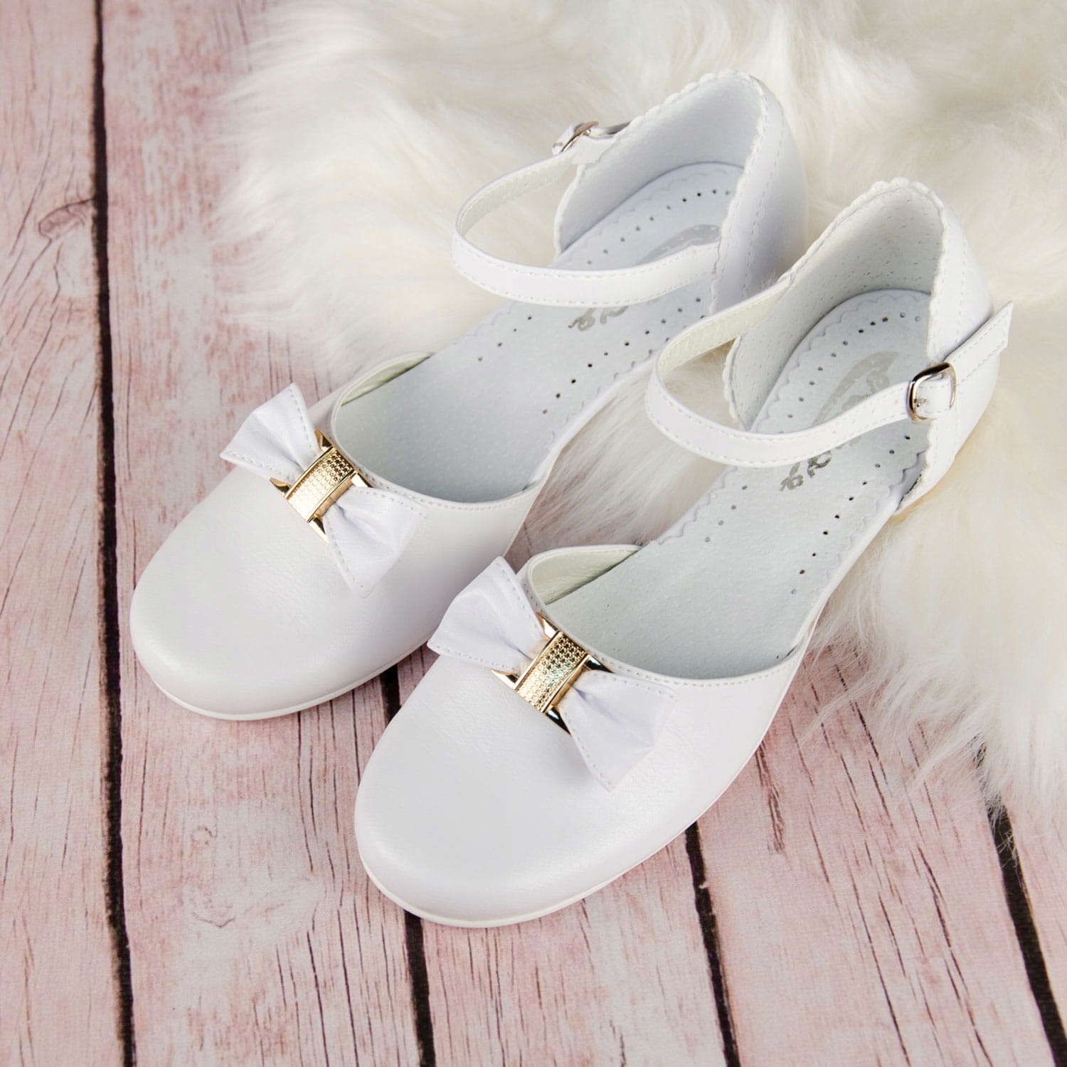 Классические белые туфли для причастия для девочек, застегиваются на регулируемый ремешок с пряжкой. Ботинки имеют правильную форму, поэтому надежно сидят на ноге. Модель имеет изящный каблук высотой 1,5 см, золотистого цвета. Очарования им добавляет красивый бантик с золотым декором. Внешняя часть обуви изготовлена из экологической кожи, а пятка и стелька – из натуральной кожи.