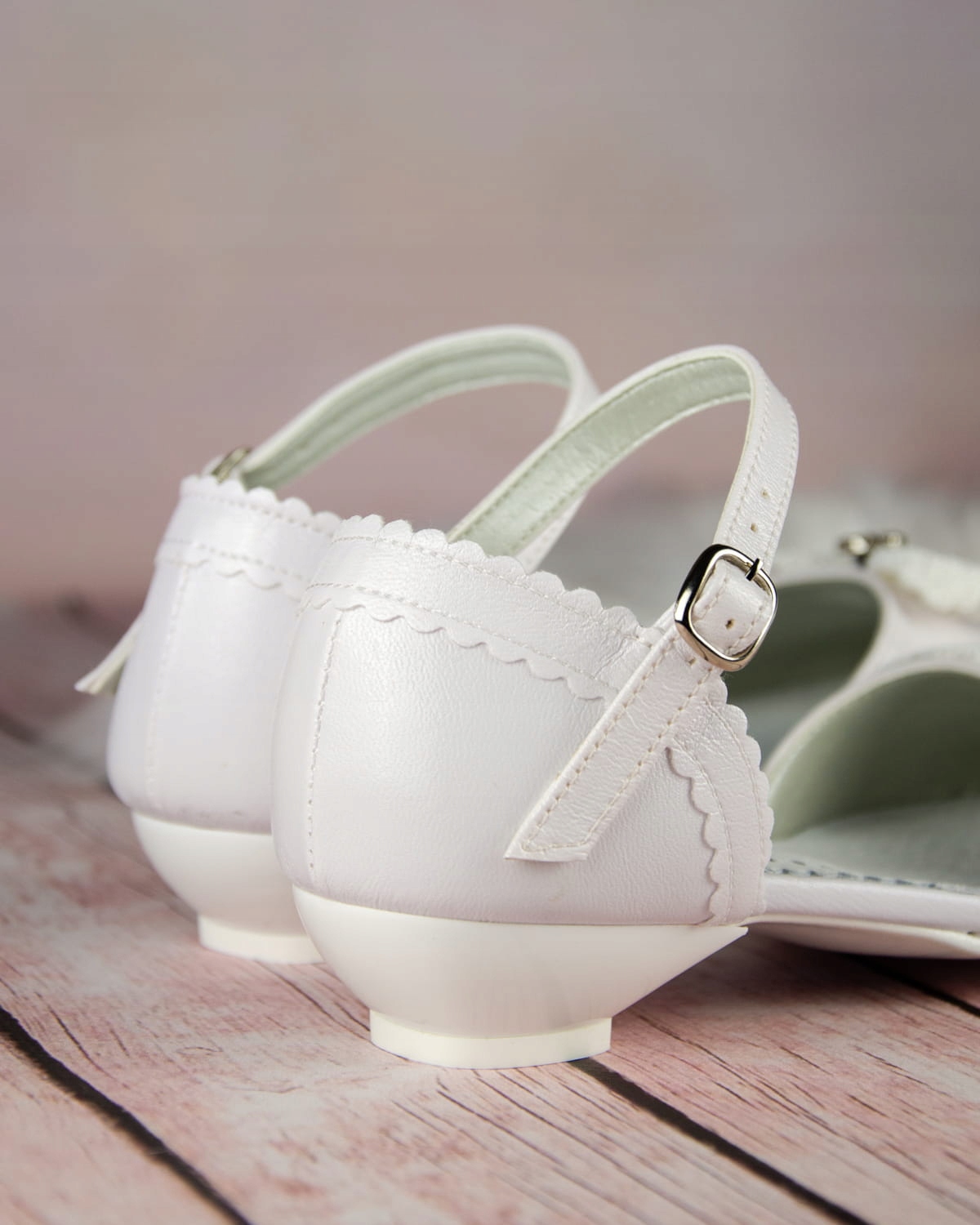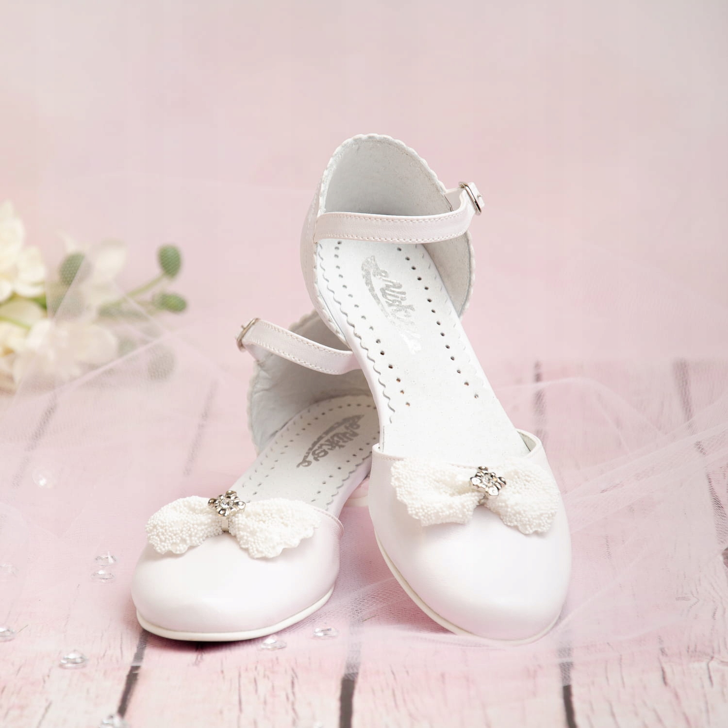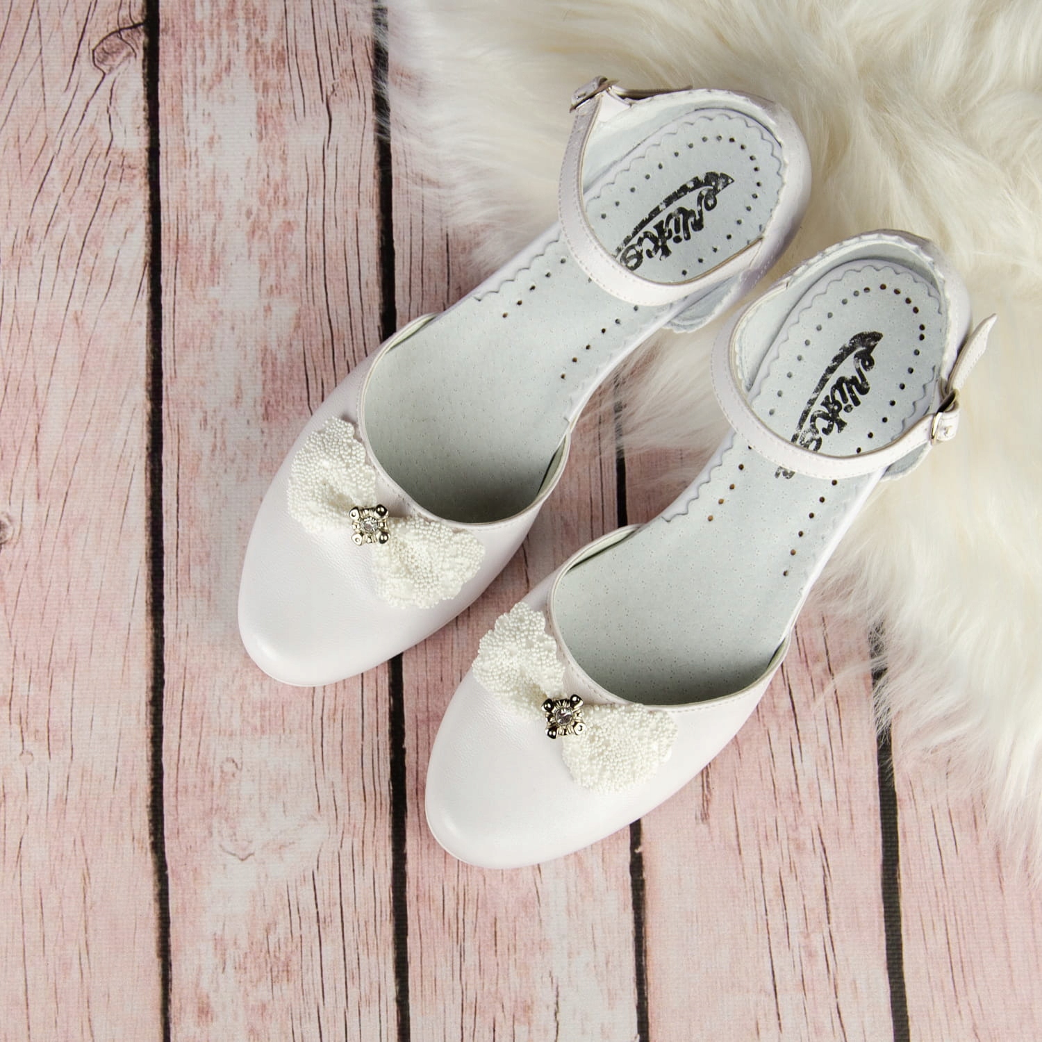 Элегантные белые туфли для причастия для девочек. Модель с застежкой и регулируемым ремешком. Обувь имеет правильную форму, что делает ее очень удобной. Модель на тонком каблуке высотой 2,5 см, белого цвета. Ее очарование усиливает бантик, украшенный мелкими бусинами и серебряным украшением. Классическая модель, которая подойдет к большинству платьев и альбомов. Внешняя часть обуви изготовлена из экологической кожи, а пятка и стелька – из натуральной кожи.