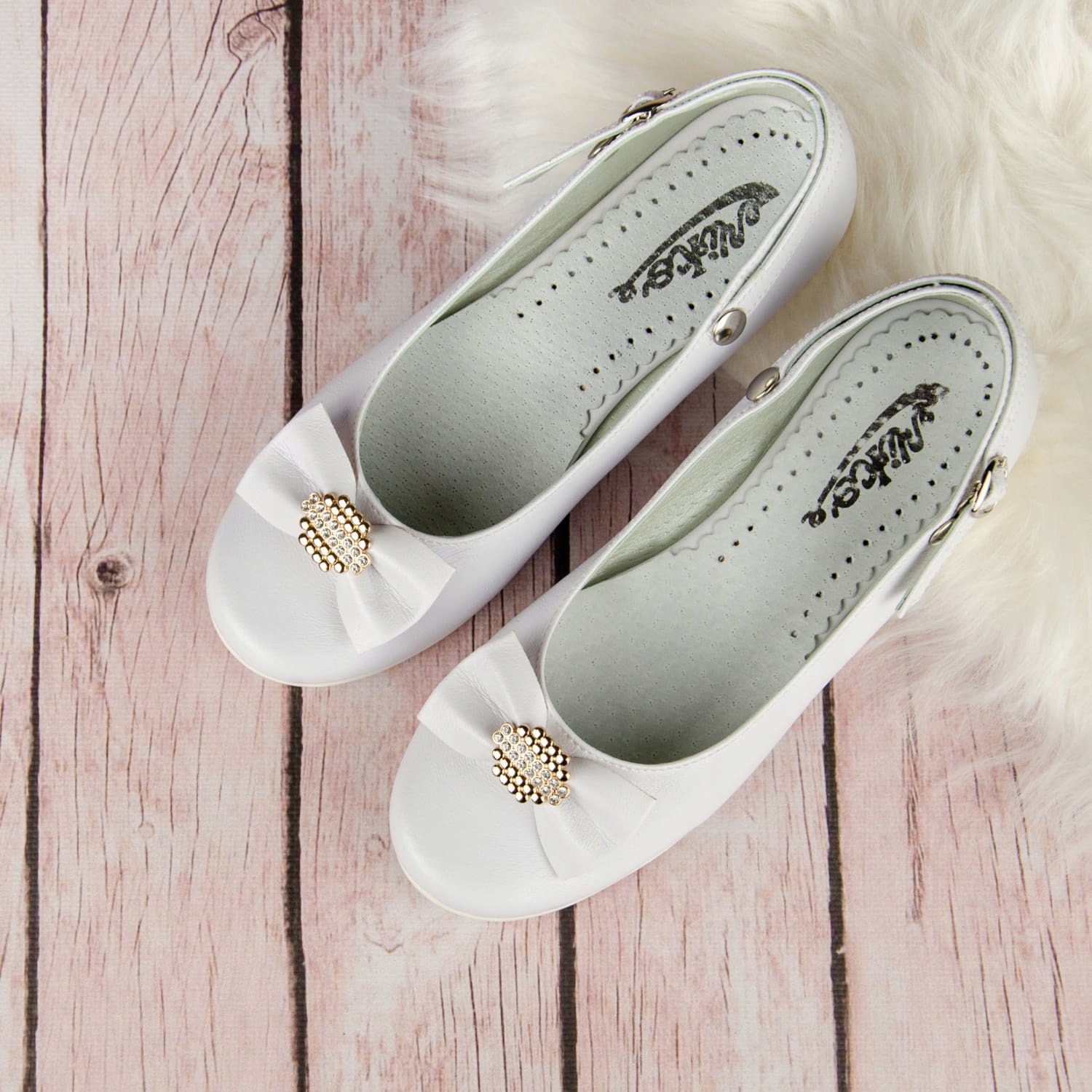 Элегантные белые туфли для причастия без шнуровки для девочек. Ботинки имеют правильную форму, поэтому надежно сидят на ноге. Кроме того, у них есть ремешок, который можно использовать спереди для лучшей поддержки стопы или сзади в качестве украшения. Модель имеет изящный каблук высотой 1,5 см, золотистого цвета. Очарования им добавляет красивый бант с золотым декором, украшенный цирконами. Внешняя часть обуви изготовлена из экологической кожи, а стелька – из натуральной кожи. Классические балетки идеально подходят для Первого причастия, других торжеств и многого другого.
