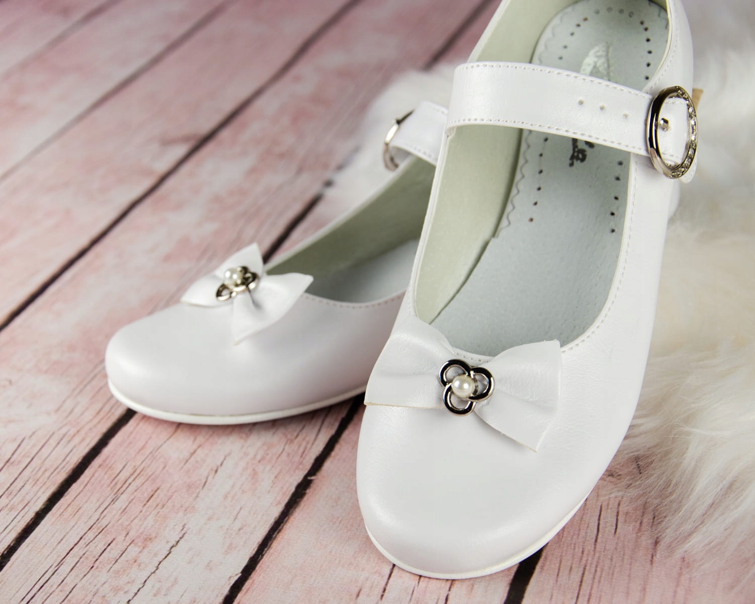 Элегантные белые туфли для причастия для девочек. Обувь имеет правильную форму, что делает ее очень удобной. Кроме того, спереди имеется ремень для лучшей поддержки стопы. Модель имеет изящный каблук высотой 1,5 см, серебристого цвета. Красивый бантик с украшением и жемчужиной посередине добавляет им очарования. Внешняя часть обуви изготовлена из экологической кожи, а стелька – из натуральной кожи. Классические балетки идеально подходят для Первого причастия, других торжеств и многого другого.