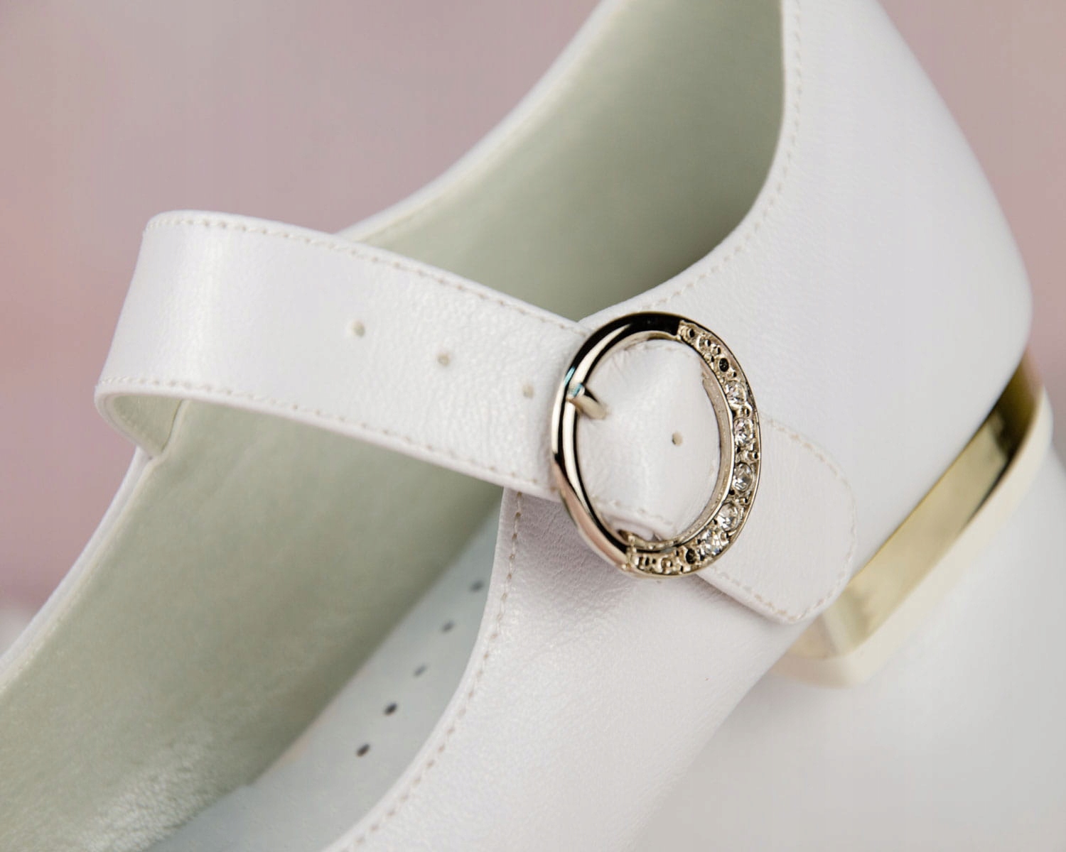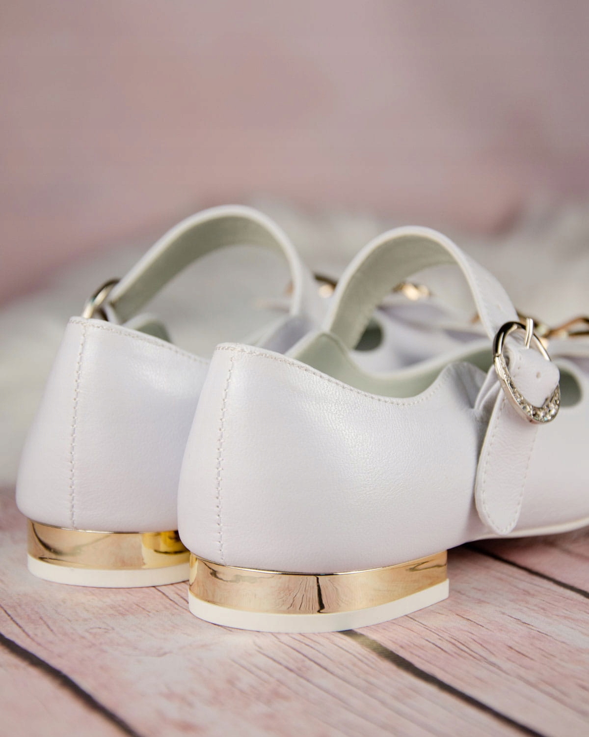 Элегантные белые туфли для причастия для девочек. Обувь имеет правильную форму, что делает ее очень удобной. Кроме того, спереди имеется ремень для лучшей поддержки стопы. Модель имеет изящный каблук высотой 1,5 см, золотистого цвета. Очарования им добавляет красивый бантик с золотым декором. Внешняя часть обуви изготовлена из экологической кожи, а стелька – из натуральной кожи. Классические балетки идеально подходят для Первого причастия, других торжеств и многого другого.