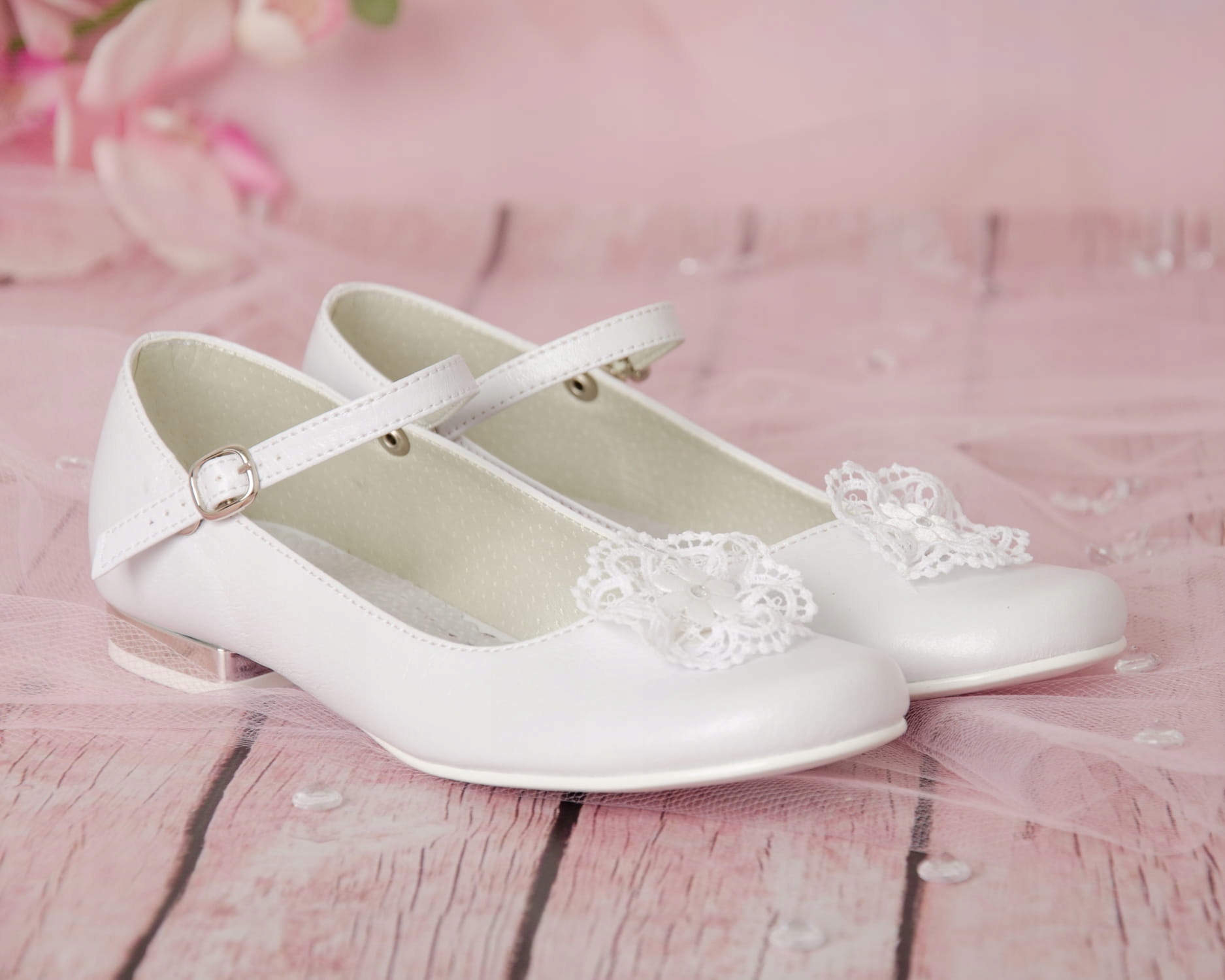 Элегантные белые туфли для причастия без шнуровки для девочек. Ботинки имеют правильную форму, поэтому надежно сидят на ноге. Кроме того, у них есть ремешок, который можно использовать спереди для лучшей поддержки стопы или сзади в качестве украшения. Модель имеет изящный каблук высотой 1,5 см, серебристого цвета. Красивый цветок добавляет им очарования. Внешняя часть обуви изготовлена из экологической кожи, а стелька – из натуральной кожи. Классические балетки идеально подходят для Первого причастия, других торжеств и многого другого.