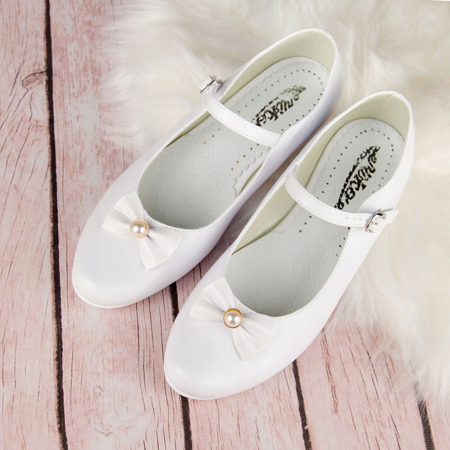 Элегантные белые туфли для причастия для девочек. Обувь имеет правильную форму, что делает ее очень удобной. Кроме того, спереди имеется ремень для лучшей поддержки стопы. Модель на тонком каблуке высотой 2,5 см, белого цвета. Очарования им добавляет красивый бантик с золотым декором и жемчужиной. Внешняя часть обуви изготовлена из экологической кожи, а стелька – из натуральной кожи. Классические балетки идеально подходят как для Первого причастия, так и для других торжеств.