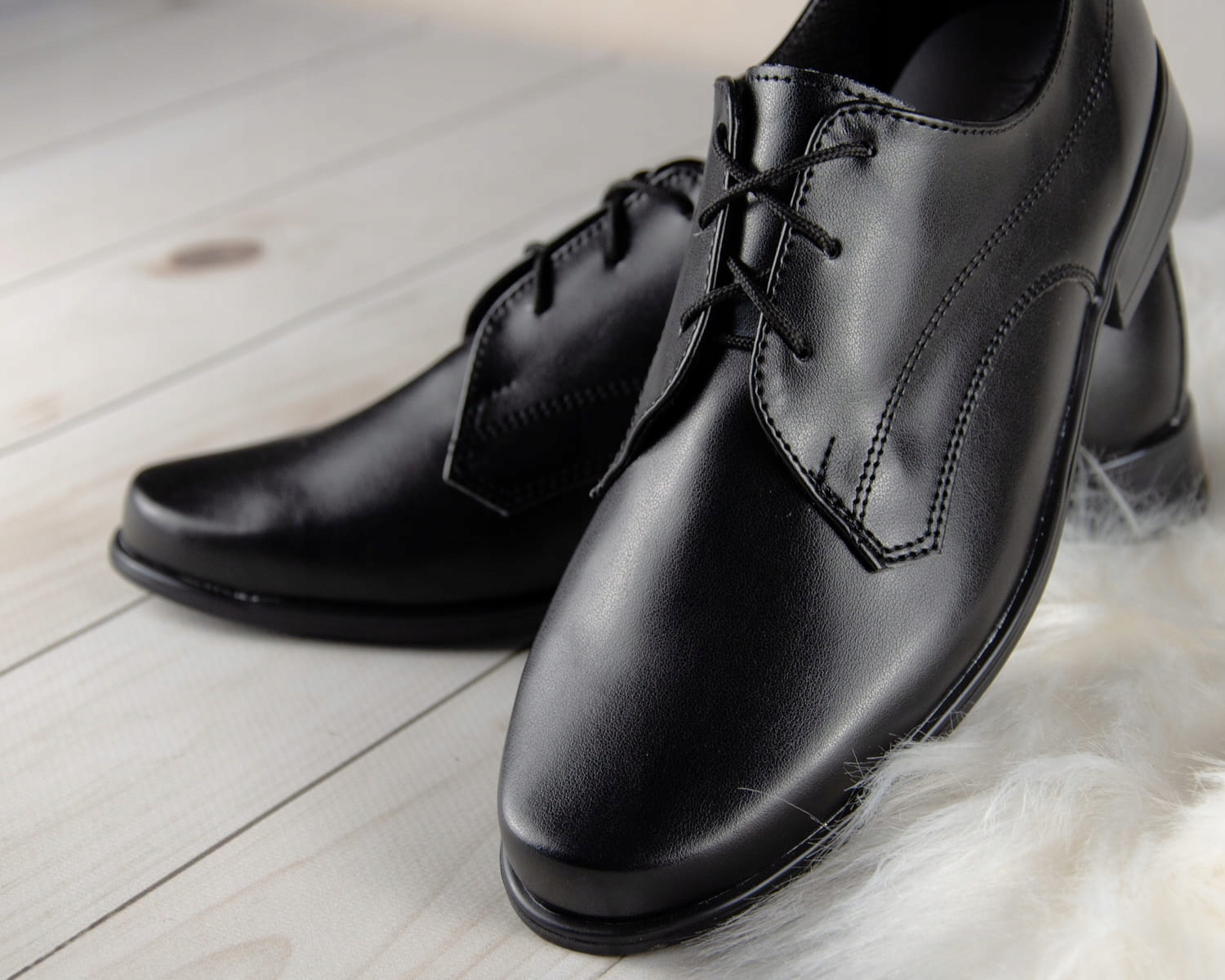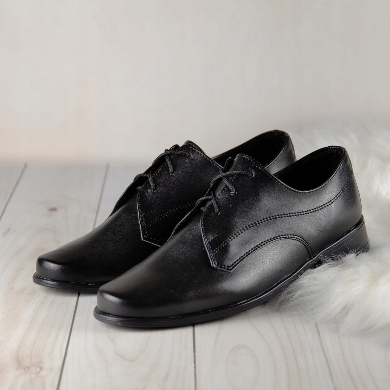 Классические черные туфли для причастия для мальчика. Обувь имеет правильную форму, что делает ее очень удобной. Внешняя часть обуви изготовлена из мягкой экологической кожи, а стелька – из натуральной кожи. Универсальная обувь, которая подойдет как к элегантному костюму для причастия, так и к классическому альбу или стихарю.