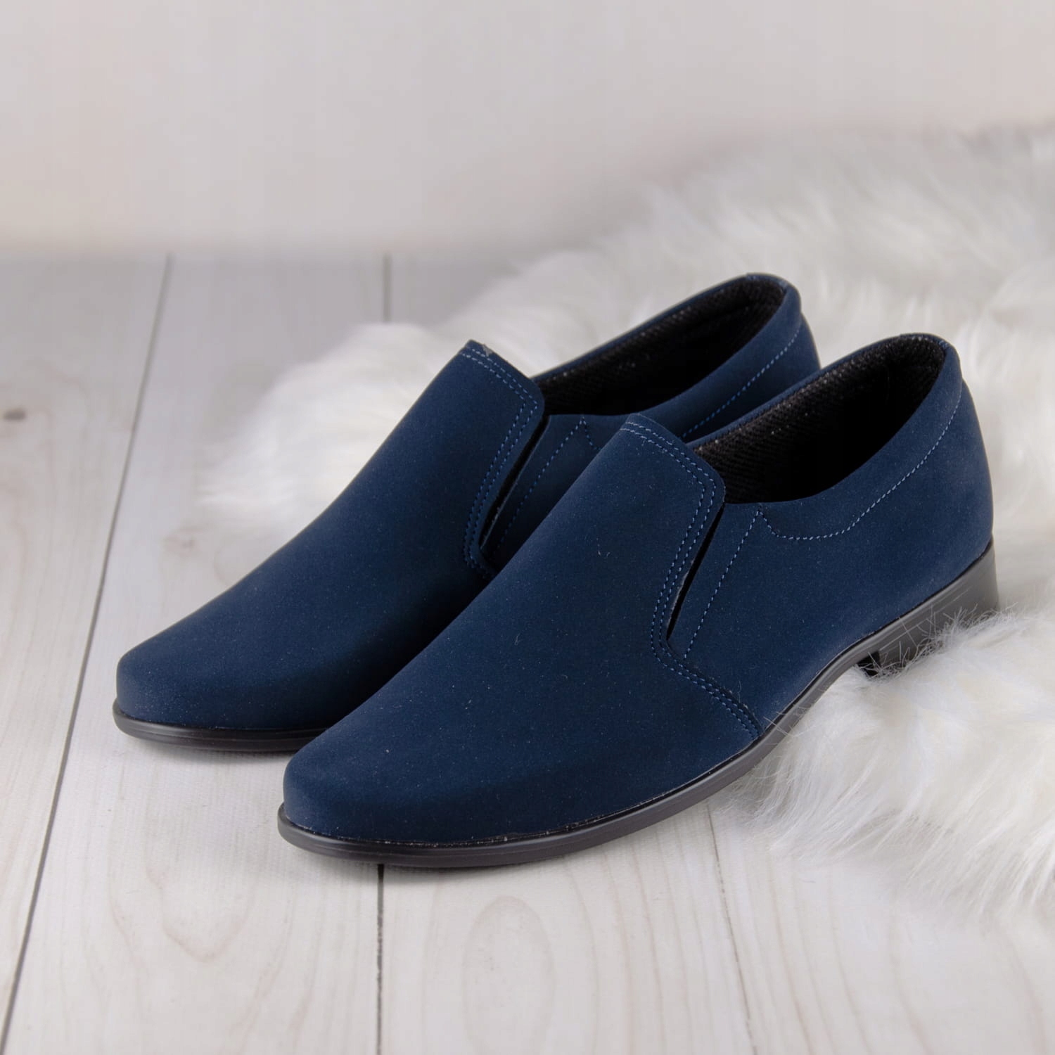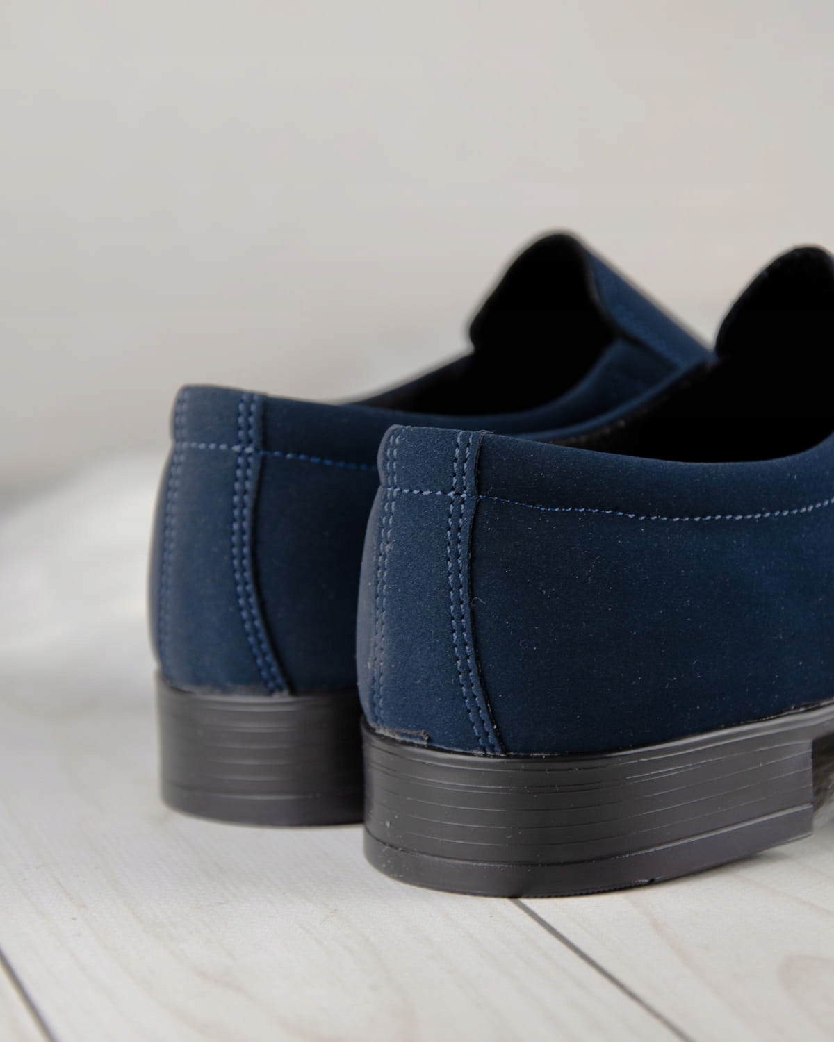 Элегантные туфли для причастия без шнуровки для мальчика темно-синего цвета. Обувь имеет правильную форму, что делает ее очень удобной. Классическая модель без шнурков, которая адаптируется к любой ноге благодаря резинкам, пришитым по бокам верха. Внешняя часть обуви выполнена из мягкого экологического нубука, стелька – из натуральной кожи.