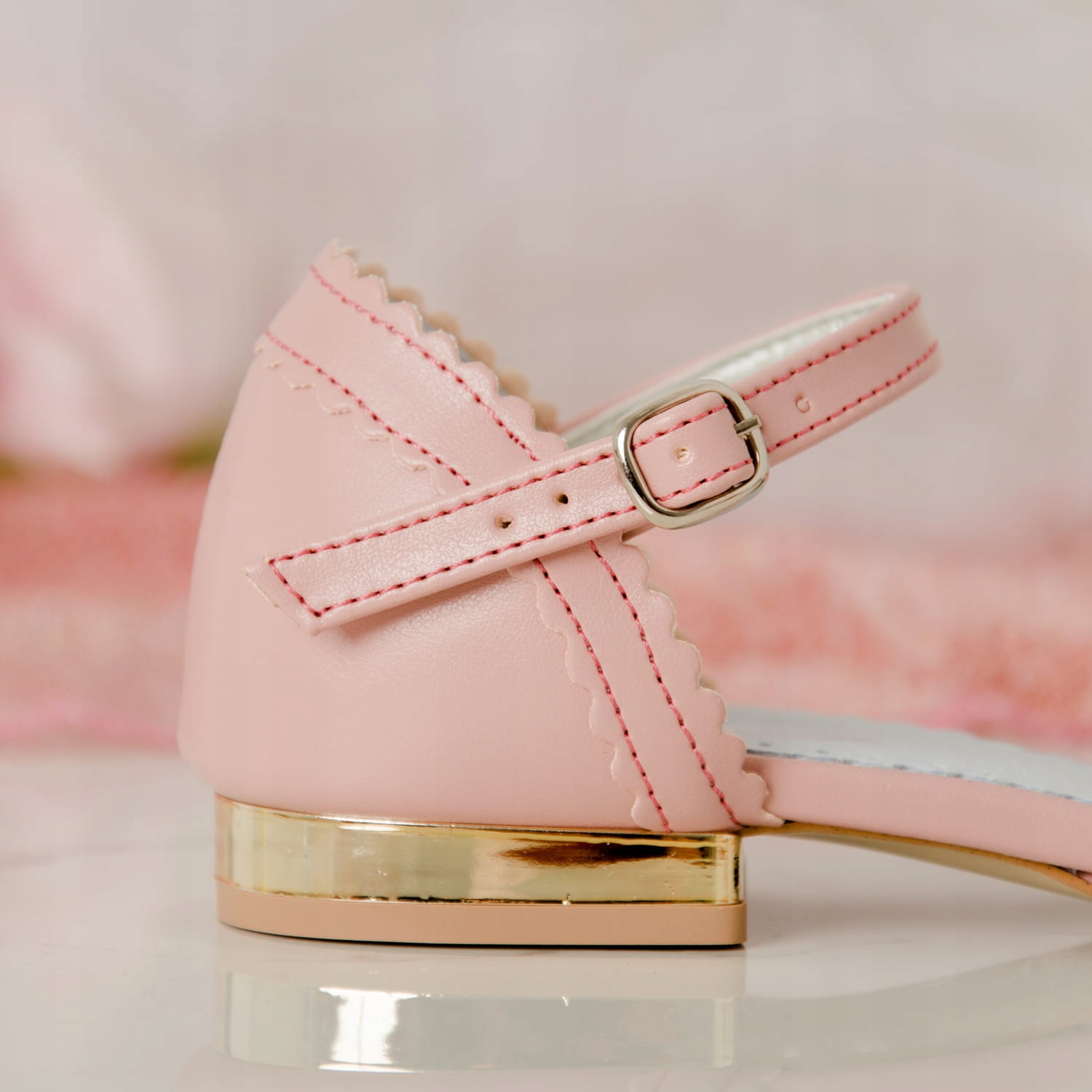 Классические розовые вечерние туфли для девочек, застегиваются на регулируемый ремешок с пряжкой. Ботинки имеют правильную форму, поэтому надежно сидят на ноге. Модель имеет изящный каблук высотой 1 см, золотистого цвета. Очарования им добавляет красивый бантик с золотым декором. Внешняя часть обуви изготовлена из экологической кожи, а пятка и стелька – из натуральной кожи.