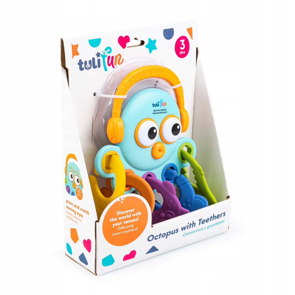 Осьминог поможет малышу для прорезывания зубов, принося облегчение для больных десен. Все благодаря красочному, съемному животному в форме полезных панелей, которые включают в себя 5! Каждый из них характеризуется различным цветом, формой и разнообразными выступами, которые во время кусания массажа бобо -ирритированных прорезывания зубов. У игрушки есть практическая ручка, которая сбивает вас с толку, чтобы комфортно перемещаться с места на место