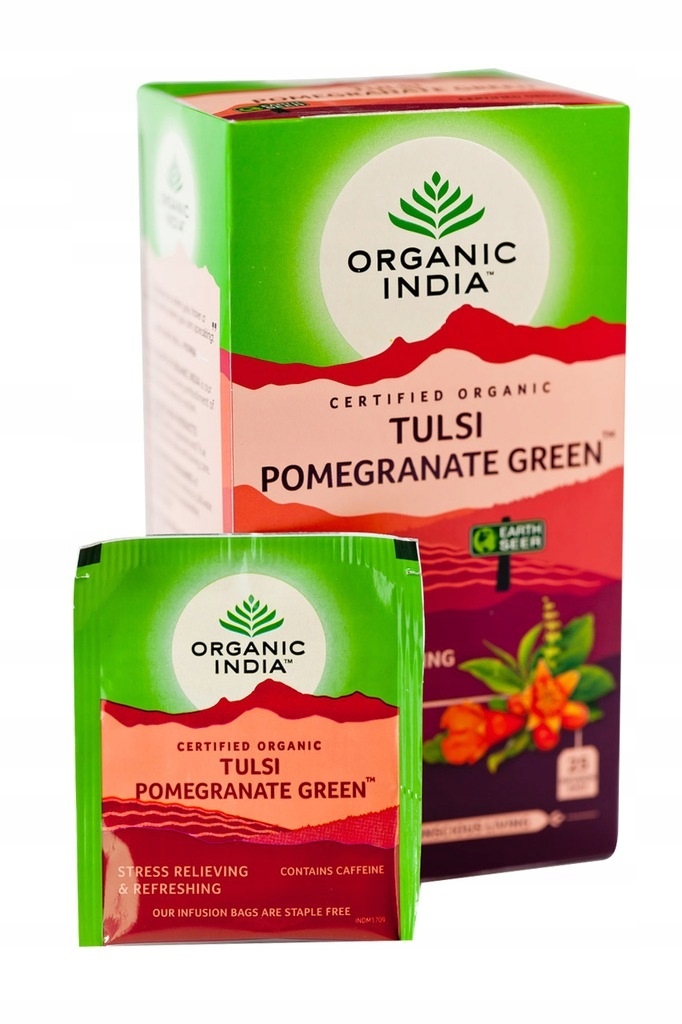 Tulsi Pomegranate Green — смесь зеленого чая с добавлением листьев граната и тулси. Тулси, также известный как священный базилик, — это растение с лечебными свойствами, широко используемое в Аюрведе. Этот чай полностью натуральный и не содержит искусственных добавок.