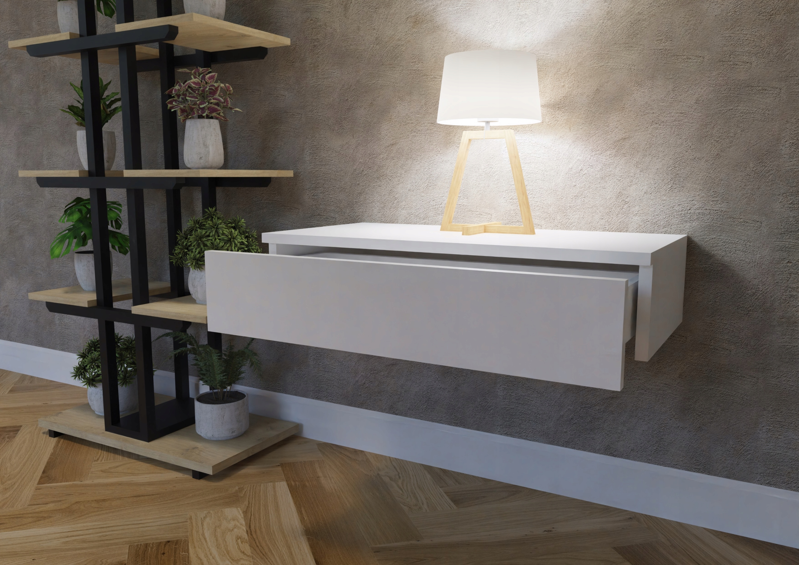 Ящик крепится на направляющих. Дно и задняя часть ящика изготовлены из ДСП, а боковины – из белого или серого металла.