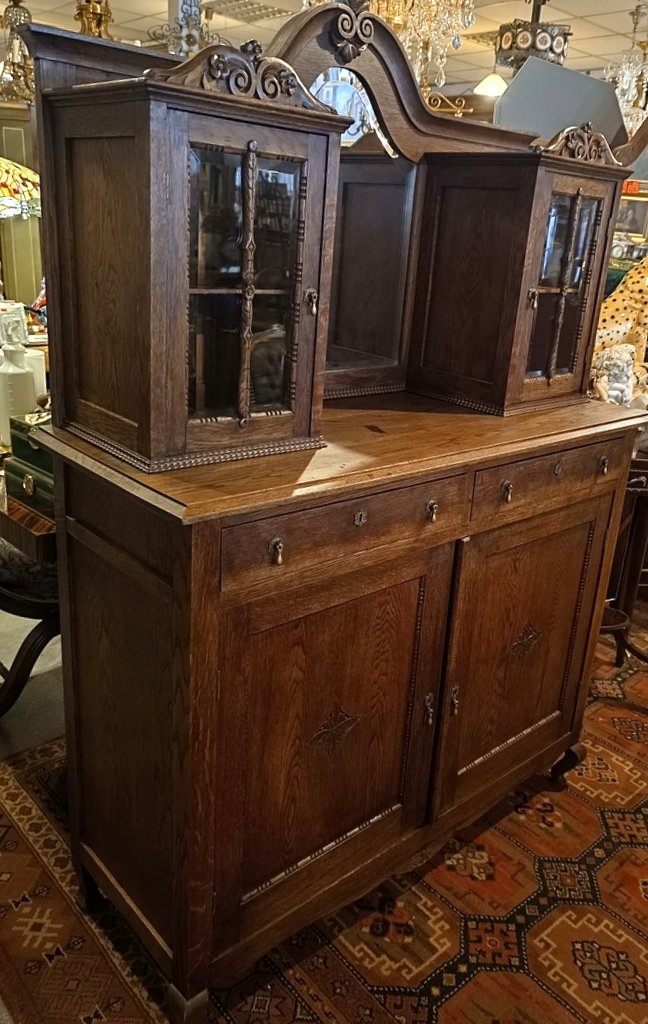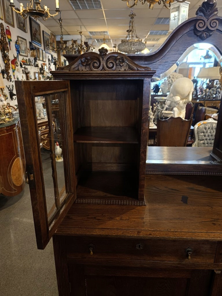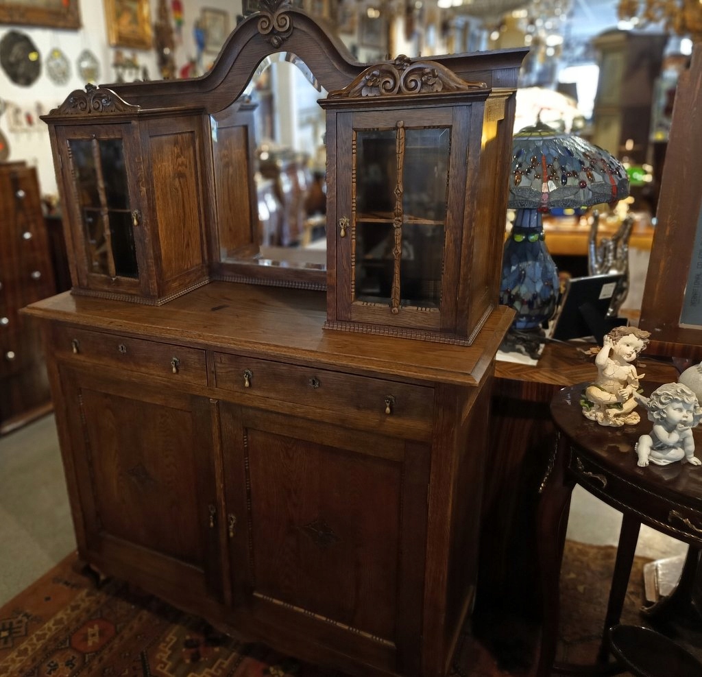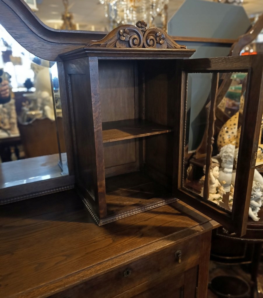 Предмет мебели, изготовленный из дуба в послевоенный период прошлого века, сохранивший старинный дизайн и стиль. Верхняя часть с двумя скошенными стеклянными витринами, разделенными зеркалом с фаской ручной работы. Нижний закрыт полноценной дверцей, за которой находится скрытый шкафчик, разделенный одной полкой. Под столешницей спрятаны два практичных ящика. Красивый цвет темного ореха, многочисленные тонкие украшения и форма – единственные преимущества; сделать предмет мебели чрезвычайно элегантным, со вкусом и практичным. Этот замечательный экспонат непременно повысит эстетическую ценность любого помещения.