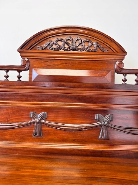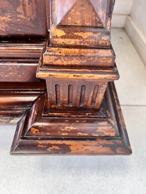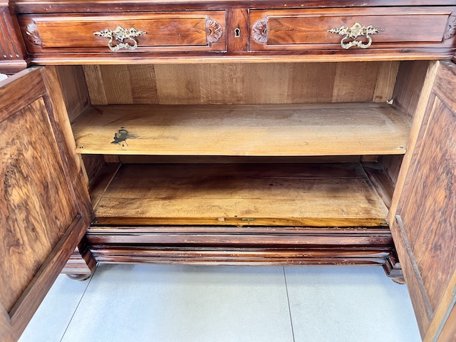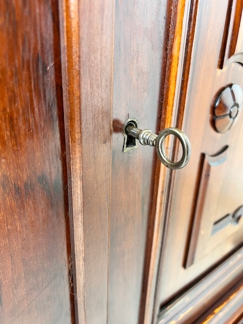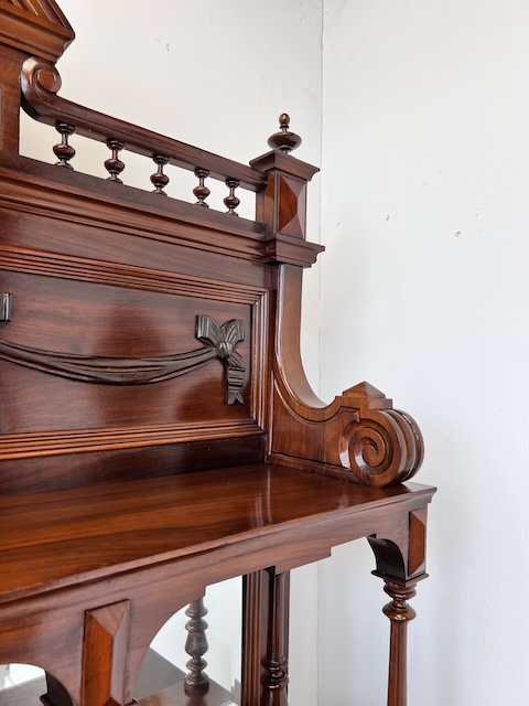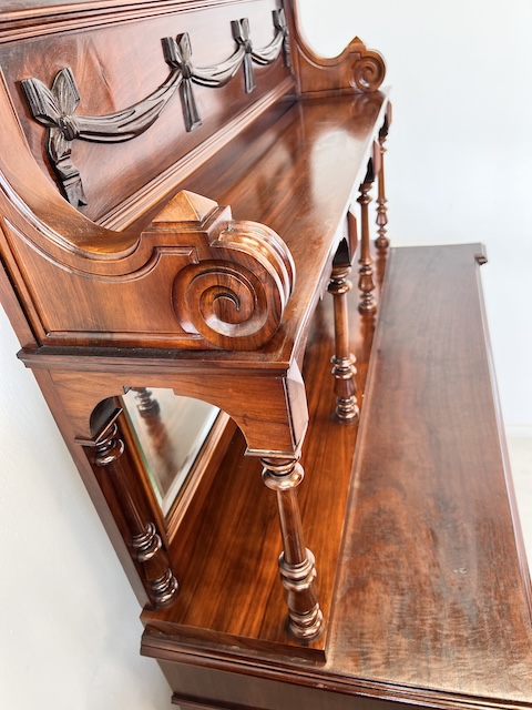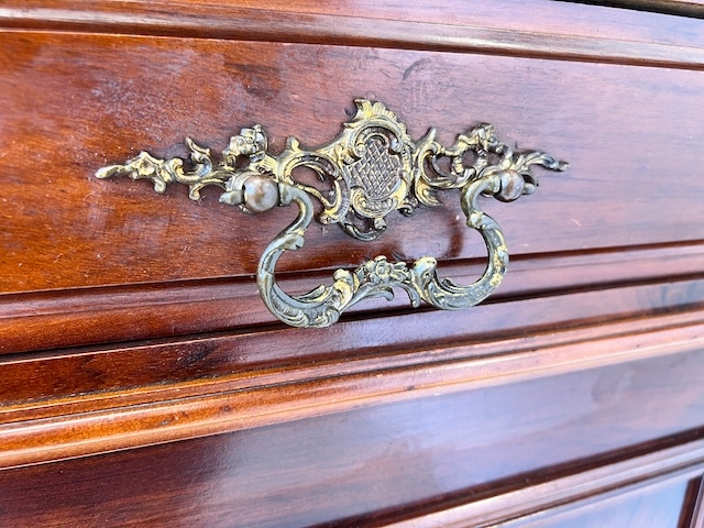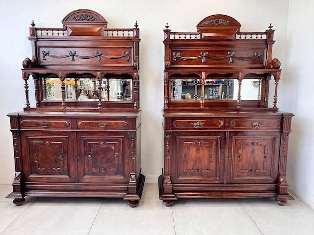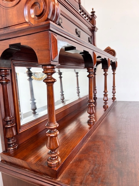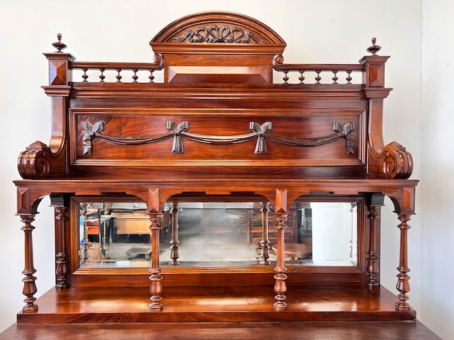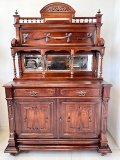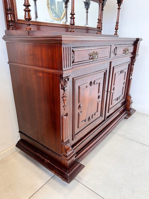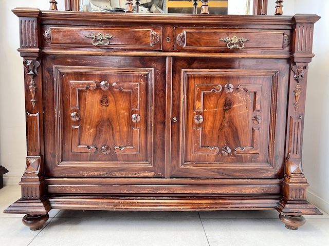 Серван из красного дерева 1937 года. Эффектный. Приставка с зеркалом красиво осветит пространство. Зеркало оригинальное, со скошенной кромкой, в хорошем состоянии. Сервант не имеет повреждений и дефектов, но имеет следы использования. Имеются небольшие, но многочисленные потертости, особенно на нижних полосках. Кажется, что лак в какой-то момент отслоился, но поверхность гладкая. Замок на двери работает, есть ключ. В ящиках его не проверяли. Нижняя часть с дверью очень вместительная и функциональная. Внутри есть полка. Комод будет отлично смотреться в гостиной, столовой или стильном офисе. Он состоит из двух элементов. Он готов к вставке.