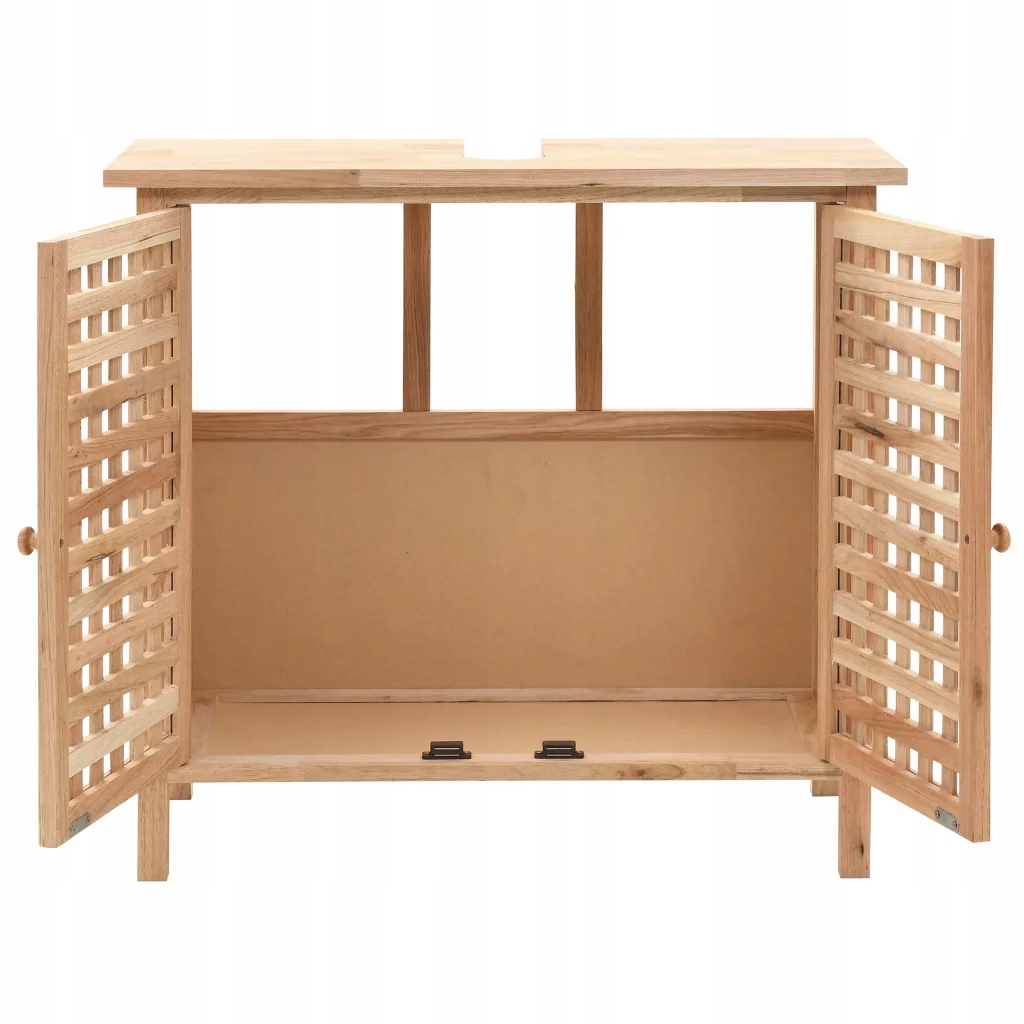Шкафчик для ванной комнаты имеет две дверцы с решеткой, что обеспечивает хорошую вентиляцию хранящихся вещей и придает элегантный шарм. Деревянный шкаф устойчив, долговечен и придаст вашему дому немного естественности.