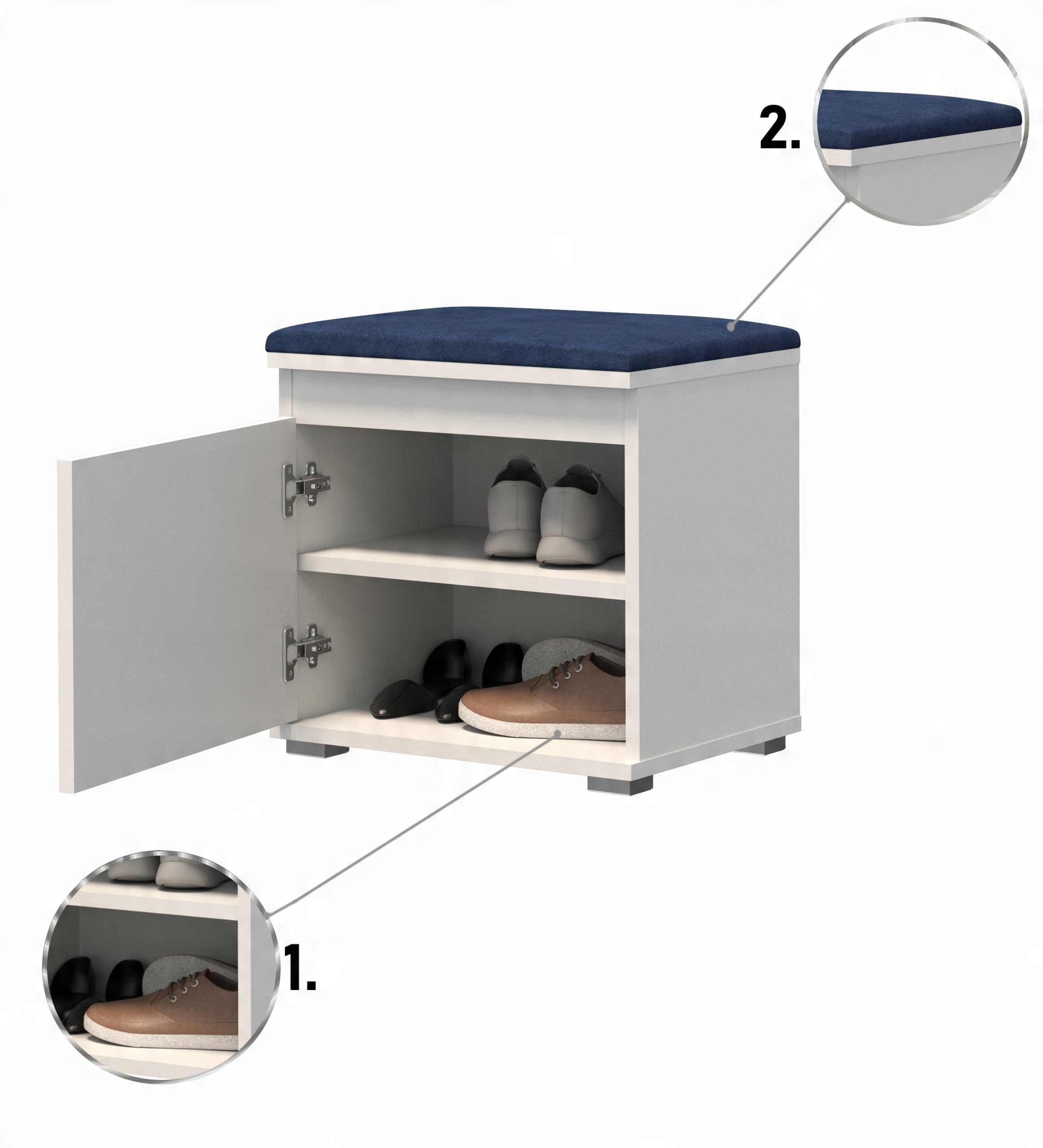 Современная обувница Nevada 50 для прихожей, доступна в 3-х цветах: белый, sonoma, крафт и с тремя цветами панелей: серый, темно-синий, бутылочно-зеленый.