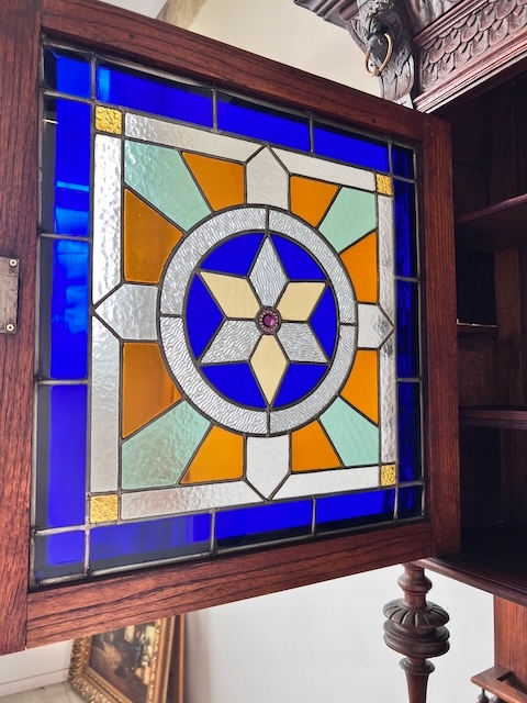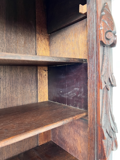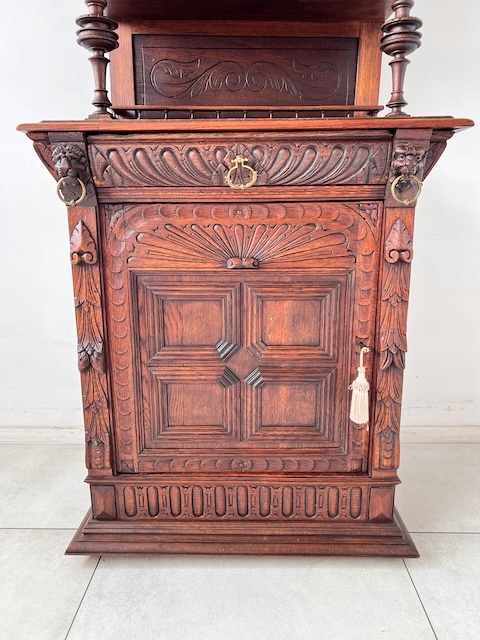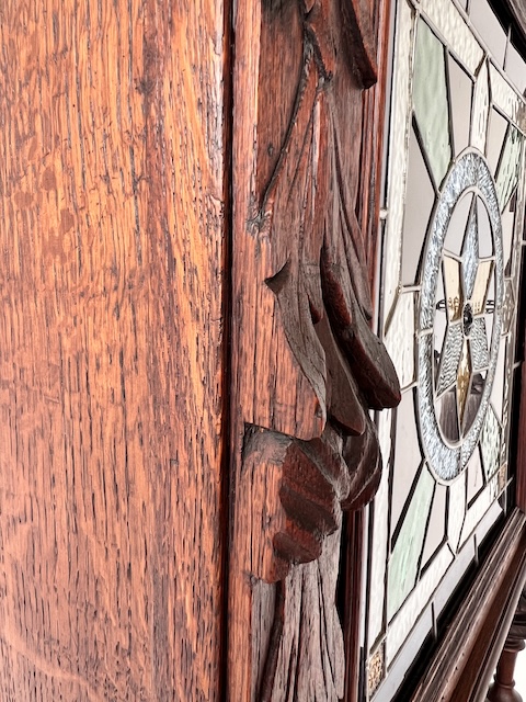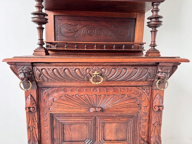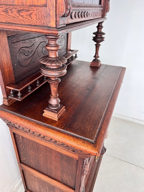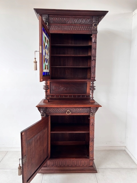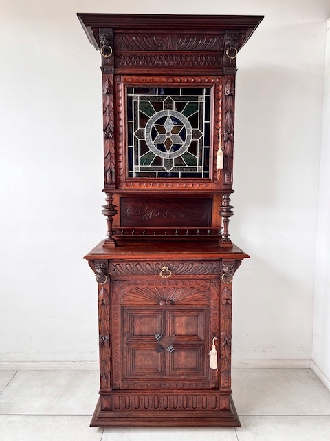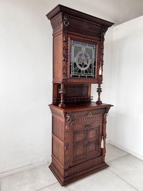 Дубовый сервант. Изготовлен из массива дерева в эклектичном стиле. По нашим оценкам, ему около 100 лет. Он находится в хорошем состоянии. Имеет характерные следы использования. Верхняя часть застеклена. В двери оригинальный витраж. За дверью три деревянные полки. Один основан на досках, а не на опорах. Под столешницей имеется практичный ящик. В нижнем шкафу имеется одна полка. Замки функциональные, с набором ключей. Помимо этих видимых многочисленных преимуществ, есть еще одно очень важное преимущество; сервант узкий. Ширина всего 89 см. Единственный недостаток, небольшой и незаметный дефект, — это скол дерева на краю ящика. Интерьер в хорошем состоянии. Сервант состоит из двух элементов. Идеальный выбор для стильной кухни или столовой. Готова к установке.