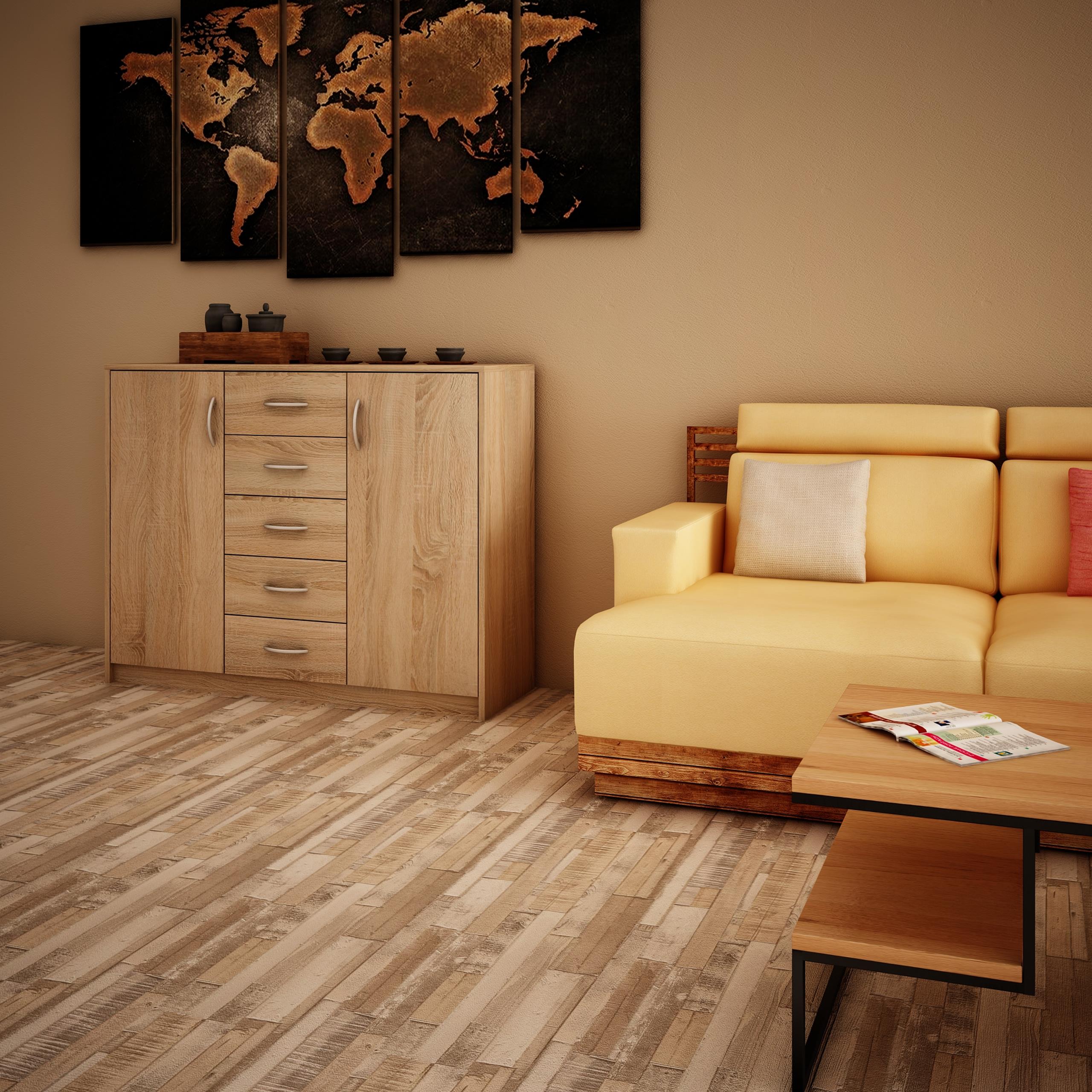 Комод 2Д5С изготовлен из очень качественного ламинированного картона толщиной 16 мм, который отличается повышенной устойчивостью к царапинам, устойчивостью к истиранию и влаге (можно протирать влажной губкой).