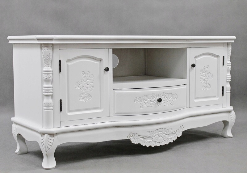 Очаровательный деревянный предмет мебели на гнутых ножках и красивой резьбе. Имеет два шкафа, полку для ТВ-аппаратуры и ящик.